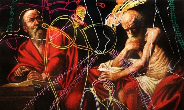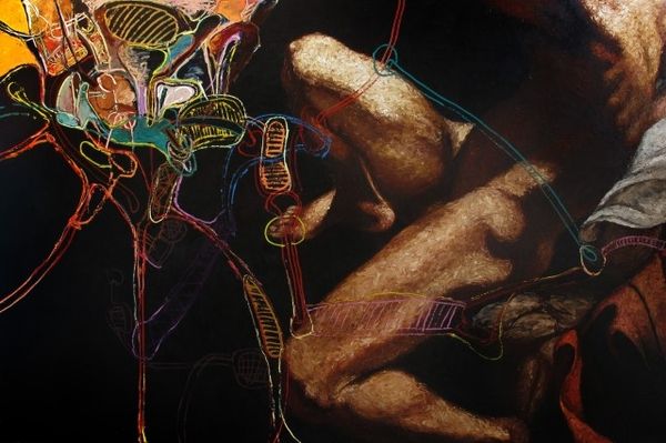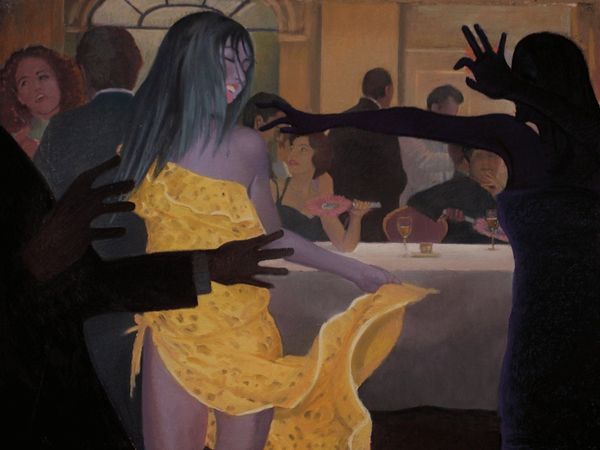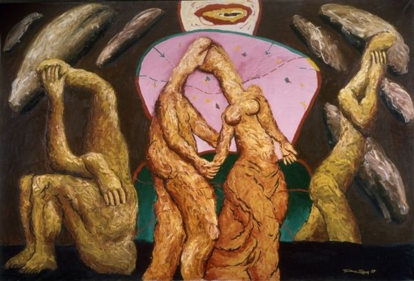 This enigmatic painting by Arturo Rivera presents us with a tableau rich in symbolic tension. The couple, marked by a certain decay, clutches at objects—a golden box, a set of keys—that hint at secrets, longings, and the ephemeral nature of earthly possessions. Consider the dog, reminiscent of the canine companions in Renaissance portraits, symbols of fidelity, yet here it seems forlorn, tethered to an uncertain fate. The shoes hanging, divorced from their wearer, evoke absence, a poignant reminder of mortality. These motifs resonate with the vanitas tradition, where symbols of wealth and beauty are juxtaposed with stark reminders of death and decay. Rivera taps into our collective subconscious, stirring primal fears and anxieties about time, loss, and the fleeting nature of existence. These psychological undercurrents engage us on a deeply emotional level, where the image becomes a mirror reflecting our own anxieties about mortality and the human condition. Such symbols progress in a non-linear fashion, evolving and accruing new layers of meaning as they resurface in the human imagination, echoing through the corridors of time.