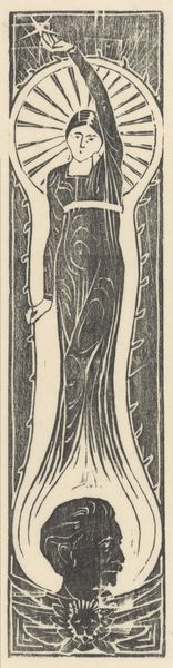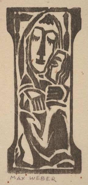 Editor: So, this is Max Weber’s "Nude with Upraised Arm," a woodcut print from around 1919-1920. It’s...striking. The figure is so stylized, almost angular. What do you see in this piece, beyond the obvious? Curator: Beyond the beautiful obvious? I see Weber wrestling with the echoes of Cubism, but bending it to express something deeply personal, almost primal. Look at how the lines carve out the form, how they push and pull against each other. There's a tension there, wouldn’t you agree? It’s not just a nude; it’s a study of energy, of feeling forced through a fractured lens. The Expressionist impulse straining against the Cubist structure – it's like a storm brewing. What do you make of the rough texture the woodcut lends? Editor: It feels very raw, unfinished almost. Not classically beautiful in the traditional sense. I feel like I’m looking at a figure struggling to emerge. Curator: Exactly! Think of it as less a portrait and more of a psychic excavation. Weber’s less concerned with anatomical accuracy and more invested in digging into the emotional landscape. The upraised arm – is it a gesture of defiance? Of surrender? Maybe both. Artists used to strive for a window into the world, no? Weber shows us a window into *himself.* Does it make you think of anything? Editor: Now that you mention it, that pose reminds me of Rodin’s sculptures... I suppose it is that expression of intense emotion you pointed out. I see the storm brewing in Weber now. Curator: It's incredible what a fresh pair of eyes can notice. Editor: Thank you for this, it will give me a lot to think about when viewing Weber's artworks! Curator: The pleasure was all mine! It is a truly unique artwork.