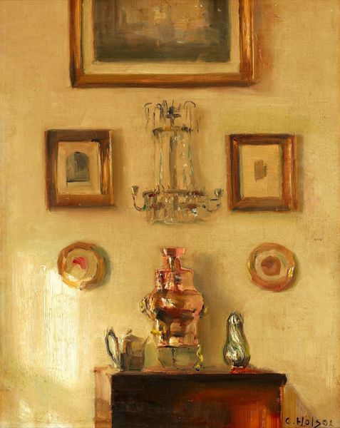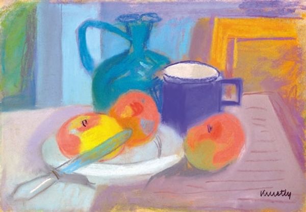 Kmetty János made this pastel drawing, "Interior", at some point in the 20th century, and right away, I’m drawn to the way the colors kinda vibrate, like they’re pushing against each other. The whole thing feels soft and chalky, almost like a dream. Look at the pitcher, it’s not quite white, but a hazy, ghostly presence. You can almost feel the graininess of the pastel on the paper, each stroke building up the image, not trying to hide the process. It’s honest, you know? Like, here’s the world, but seen through a layer of feeling. And that cabinet in the background, it's not just a thing, it's got this orange glow that makes it almost alive. It reminds me of Morandi, how he could make simple objects into these deep, emotional landscapes. It’s like János is saying, "Hey, look at the beauty in the everyday, the things we usually ignore." Art’s not about answers, it’s about how we see, and feel, and keep the conversation going.