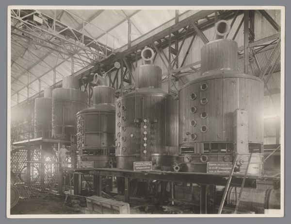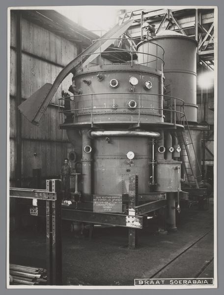 Curator: So, here we have a photograph titled "Twee serpentijn kookpannen," which translates to "Two Serpentine Cooking Pots," possibly taken in 1933. It’s part of the Rijksmuseum collection. Editor: It's intriguing! I'm initially struck by how the photographer captured the monumental scale of these industrial objects and their arrangement within what looks like a factory space. There’s a textural interplay between the corrugated metal walls and the smooth, cylindrical forms of the pots themselves. How would you interpret this work, focusing on its compositional elements? Curator: From a purely formal perspective, notice the repeated cylindrical shape. The photograph creates a balance through the almost symmetrical placement of the two objects, counterpointed by the figure who breaks that symmetry, adding depth and scale to the work. Note how the photograph uses contrast and detail in a carefully arranged design to accentuate these industrial forms, without offering any critique. How does the composition direct your eye? Editor: I notice how my eye keeps being drawn to the textures on the metallic pots versus the corrugated building. The photograph emphasizes their textures equally in grayscale, though they seem very different to the touch. The artist could have easily removed the man for compositional balance. It’s very intentional. What do you make of the overall effect, considering only visual elements? Curator: It evokes a stark grandeur. The forms possess a tactile and monumental presence heightened by the monochromatic tones and stark lighting. It is a marriage of functionality and aesthetic; an appreciation of form and industrial power. How would you now characterize your initial emotional response, given the compositional strategy at play? Editor: I think my appreciation for the formal elements gives me more appreciation for its overall impact now that I see it's an intersection of utility, artistry, and careful artistic considerations. Curator: Indeed, seeing the work as an exploration of form and structure reveals an artistic sensibility not immediately apparent, prompting us to reconsider our expectations of industrial photography.