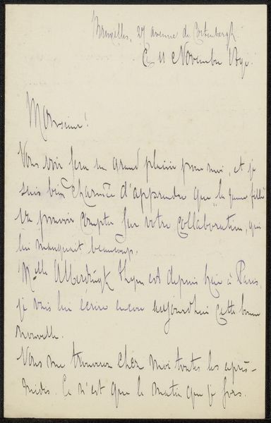Editor: So, this is "Brief aan Françoise W.M. Bonger," a letter from possibly 1960. It's ink on paper, with some lovely calligraphy. It feels so personal, like peeking into someone’s private correspondence. I wonder about the circumstances of its production. What's your take on this work? Curator: What strikes me is how the conditions of its making—the 'American Hotel' letterhead, the visible wear on the paper—shape its meaning. We aren't simply viewing words; we are confronting a material object embedded in a network of production and exchange. Think about the hotel, a site of transit and commerce. How does this influence our reading of what is ostensibly a personal note of thanks? Editor: That’s interesting. I was focusing on the content of the letter. Does it matter that the context seems so...ordinary? It’s not like it's a royal decree or anything. Curator: Precisely. Its "ordinariness" is crucial. It disrupts the traditional hierarchy between high art and everyday life. This letter elevates the value of craft through labor and the handwritten. It's important to consider how the act of writing itself, a form of manual labor, imbues this object with significance. We can ask, who benefits from this labor, and how does its purpose tie into social relationships? Editor: So, you’re saying its value isn’t just in its message, but in the process of its creation and the environment it comes from. Like, it's not just the art of the words, but the art of… living, almost? Curator: Exactly! We examine its materiality and its position in a web of social relations. Examining how it challenges how we understand not only the intent but production and dissemination as artistic processes. Editor: I never thought of analyzing something like this letter through that lens before. It’s definitely changed my perception of everyday objects. Curator: Mine, too. Considering materiality, social dynamics, and the modes of production enhances the context within which this creation exists.