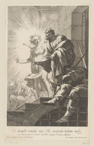 Curator: Here we have an engraving titled "The Bible in Pictures" by an anonymous artist, part of the Harvard Art Museums collection. Editor: Wow, the first thing that hits me is light—almost blinding, hopeful. It’s like witnessing something momentous. Curator: Indeed. The image and the biblical texts printed below, evoke the narratives of creation, linking God’s image to power and divine authority in ways that can be understood through theological interpretations. Editor: I think there’s something deeply personal about the figure’s expression, though; a tenderness amidst the grandeur. It humanizes the divine, really. Curator: That’s a valid interpretation, and perhaps we could examine how cultural contexts shape our contemporary understandings of these images. Editor: It’s a thought-provoking piece, challenging us to confront representations of power, religion, and humanity. Curator: Absolutely, and to reflect on the stories we tell ourselves through art.
