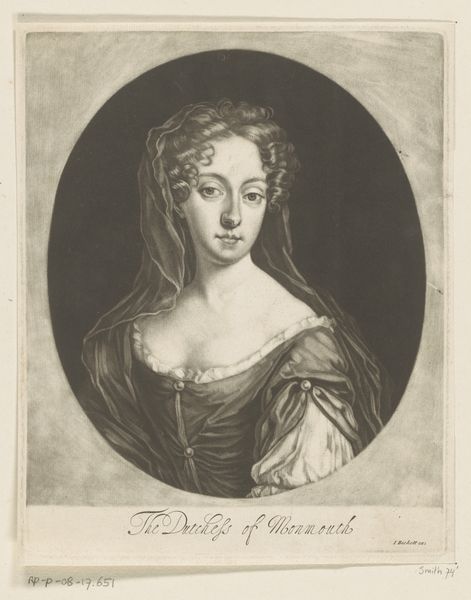 Curator: I find this engraving so striking. It’s "Portret van Anna Brueghel," dating back to between 1758 and 1804, artist Jean-Baptiste Michel, here in the Rijksmuseum collection. It presents a fascinating intersection of portraiture and printmaking techniques from the Baroque period. Editor: You know, my first thought isn't about technique. I'm immediately drawn to her eyes. They're intense, almost like she’s questioning you, or maybe pleading. It gives the print an unexpected weight. Curator: That emotional register stems in part from Michel's masterful use of chiaroscuro, achieved through delicate lines and hatching. The subtle gradations of tone render depth and volume to Breughel's face, focusing attention on the gaze that you so aptly notice. Note how this artistic method conforms to academic theories on visual hierarchy... Editor: Hierarchy aside, there’s something very intimate about this. Even the Baroque oval frame around her seems to isolate her, highlighting this intensely human connection, regardless of any art theories in play here! Curator: True, the oval frame accentuates her gaze, acting as both boundary and portal, almost suggesting themes of constraint and expression operating simultaneously. How the formal choices subtly complicate her status, right? Editor: Right! Even her clothing and jewelry feel symbolic—elegant, yes, but almost understated, creating this poignant tension between the artist's representation and whatever was really going on with Anna herself. What a character she was! I imagine, or like to! Curator: Precisely. This piece encapsulates not just a physical likeness but also nuances in mood through considered application of line, tone, and the carefully staged presentation that marks the Baroque portrait, now permanently caught for all eyes! Editor: To see Anna caught, poised there. That’s how stories outlive everyone—her vulnerability preserved within those crisp lines. It kind of sends chills down my spine... It all connects, doesn’t it, beyond centuries and styles... that's art.