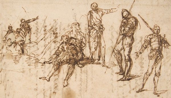 Curator: Alright, let's spend a little time with this drawing, "Christ and the Adulterous Woman." It’s an ink drawing, dating back to 1616, by Gerard ter Borch the Elder. Editor: There's a rawness to it that’s captivating! You immediately get a sense of high drama, like you're witnessing a pivotal moment. It’s rendered so dynamically, full of gestural lines and contrasts, and a lot of energy. Curator: Exactly! Ter Borch really captures the psychological tension. The composition is quite fascinating, when you delve into its formal properties. Note how the artist employs diagonal lines to direct our gaze toward Christ, the clear focal point within this complex assembly. Editor: That central figure of Christ feels strangely calm, considering. I see that everyone else is caught up in their own drama. Are some about to stone this woman? Curator: Precisely, the Pharisees test Jesus, trying to trip him up with Mosaic Law, goading him into punishing the adulteress. Yet Jesus famously offers that profound challenge: “He that is without sin among you, let him first cast a stone at her." Editor: That's what it’s about. But what is the person right up front doing? The lines aren't very detailed, so it’s hard to tell. Curator: That is meant to be Jesus. The bending posture illustrates Christ's reluctance; his action of drawing in the dust on the ground signifies thoughtful contemplation as he’s figuring out what to say and do. Editor: The ink is applied with such varying pressure. Some of these faces almost become caricatures, filled with judgmental severity, but there’s real beauty and vulnerability too. You are getting it all! Curator: The composition is beautifully balanced, almost Baroque, isn't it? The ink medium lends itself very well to dramatic figuration like this. We are also invited to ponder themes about forgiveness, law, morality and so forth. Editor: Ultimately it makes you think about who is truly innocent. Curator: Ter Borch's exploration of faith and humanity still resonates deeply. I notice something new each time.