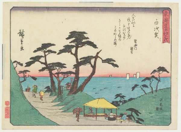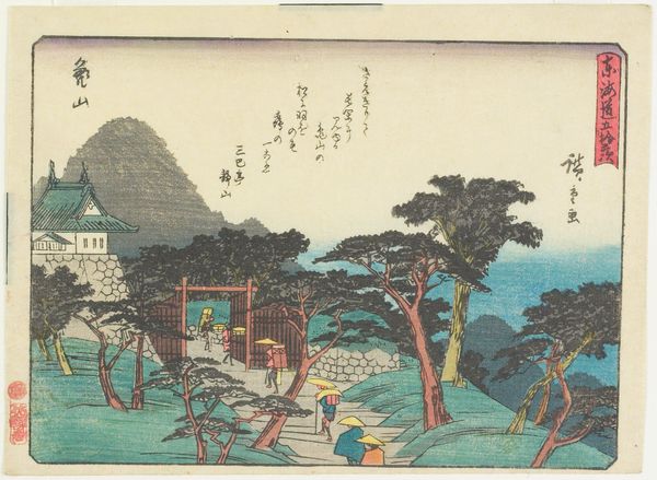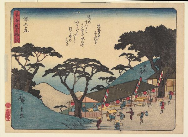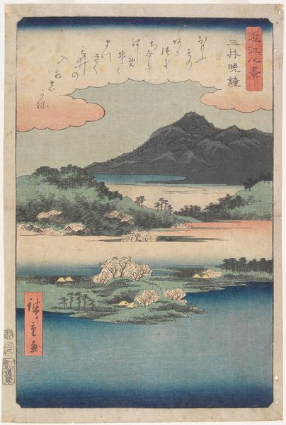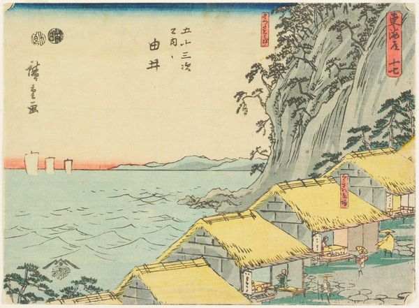 Editor: Here we have "Autumn Moon at Seto" by Utagawa Hiroshige, created around 1835 to 1839. It's a woodblock print, with ink and watercolor, giving it such a delicate feel. I'm immediately drawn to the serene mood and how the moon is reflected in the water. What do you see in this piece? Curator: The moon… ah, Hiroshige's moon isn’t just a celestial body; it’s a portal. You know, it reminds me of when I was wandering through Kyoto, utterly lost, yet feeling profoundly connected to everything. The way the bridge seems to fade into the mist hints at journeys both literal and metaphorical. Doesn't it almost feel like stepping out of one dream and into another? Do you sense the figures on the bridge going somewhere specific or simply existing in the beauty of that moment? Editor: That's a lovely way to put it! It makes me think of those liminal spaces, like that moment just before you fall asleep. They do seem content. What about the composition of the houses? Are they important for something besides local color? Curator: Absolutely. Notice how they anchor the composition. In ukiyo-e prints, there’s often a careful balance between nature and human presence. I imagine these houses are buzzing with quiet domesticity. You can almost hear the soft murmur of conversations and smell the rice cooking. What stories do they whisper to you? Editor: Hmm, it evokes a sense of home and belonging, but also transience—given they're witnessing this serene moment under the moon. Curator: Precisely! Hiroshige’s genius lies in capturing that very fleeting beauty and quiet permanence. And the tradition, think about that. This scene occurred hundreds of years ago, and will reoccur indefinitely. Editor: I never considered the element of permanence coexisting with such fleeting beauty. Thank you! Curator: The pleasure was all mine. These woodblock prints; little capsules of zen just waiting to be opened and breathed in.
