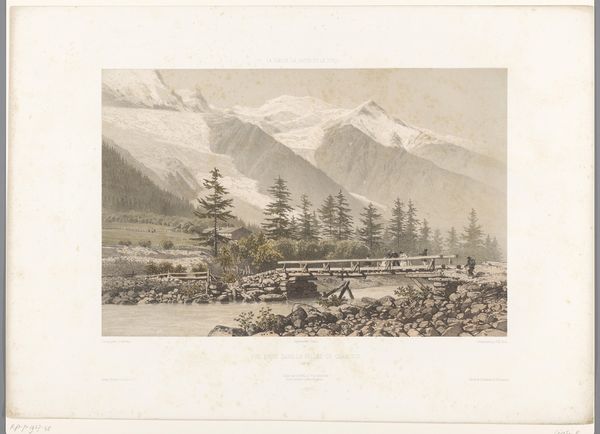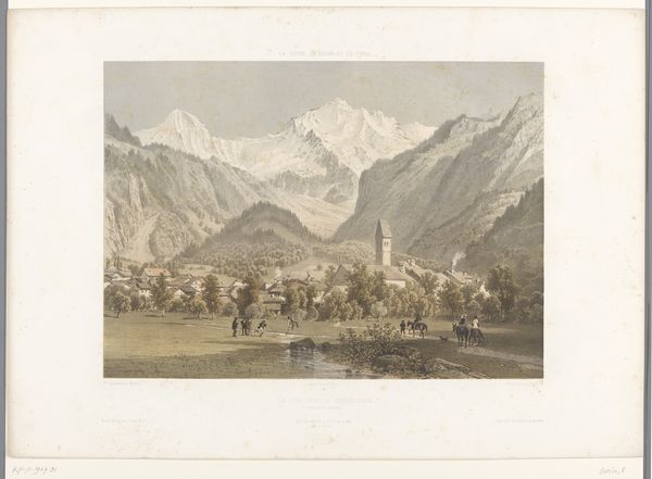 Curator: This is Carl Ludwig Hackert’s “View of Chamonix at the Foot of Mont-Blanc," created around 1780. It’s a watercolour done en plein-air, characteristic of the Romantic landscape style. Editor: Wow, it’s breathtaking, but in a very controlled way. The majestic scale of the mountain is undeniable, but the whole composition feels very deliberate and almost staged. Curator: Indeed, Hackert’s landscapes are not just about depicting nature. As you mentioned, their construction is deliberate; think of how landscapes were deeply implicated in shaping national identity and aspirations. Chamonix, as a spectacle of the sublime, became a popular site to visit by aristocrats who would then acquire paintings of it. Editor: So it’s as much about the gaze of power as it is about the mountain itself. The people in the foreground almost look like they’re there for our benefit, as a focalizing lens onto the ‘awe-inspiring’ vista for consumption. Curator: Precisely! Hackert places us in the position of the enlightened viewer, experiencing the sublime. The detailed rendering also demonstrates artistic prowess and promotes a scientific interest in cataloging the natural world. These landscape images contributed to a cultural project as well as served the interests of an economic system rooted in tourism and collecting. Editor: Thinking about this now, I am questioning the way we have idealized the Romantic movement through the art canon while downplaying that even “nature” in art comes framed by specific interests. Here it's not just an appreciation for natural beauty; but an active performance of privilege. It even seems to justify certain inequalities by reinforcing a belief in the sublime potential available to everyone. Curator: I agree that understanding the art of the Romantic period necessitates analyzing these intertwined ideological complexities and understanding its political impact beyond simplistic understandings of ‘beauty.’ Editor: Reflecting on this, I feel like it challenges the concept of 'pristine' nature as we witness it here and exposes landscape paintings as instruments entangled in socioeconomic structures. Curator: Very insightful! Thank you. Editor: My pleasure, I learned a lot, too.
