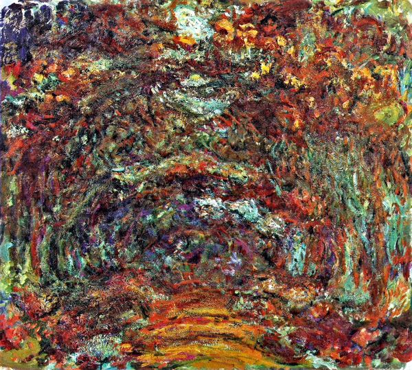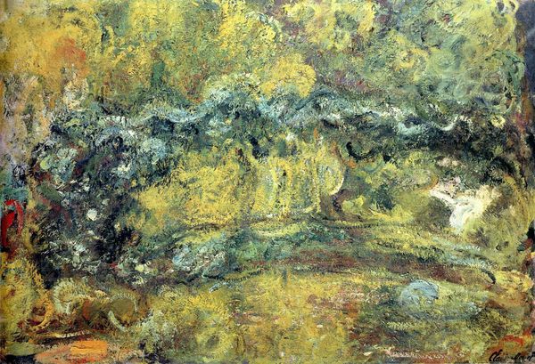 Claude Monet painted this "Japanese Bridge" with oils, and when you look closely, you can see how much he was into the *process* of making art, as much as the final picture. The painting is all about texture, color, and surface. Thick paint, laid on with visible brushstrokes. Is it possible to tell what kind of brushes or tools he used? Maybe. But what’s cool is that the materiality shapes how we feel about the piece, its emotional vibe. Check out the bottom right corner, where the red bleeds into the green – it’s almost like a little accident that becomes the whole point! Monet's obsession with light and color reminds me of Turner. Both artists explore how color can be both descriptive and totally abstract. Art isn't about fixed ideas, but about keeping the conversation going, right?