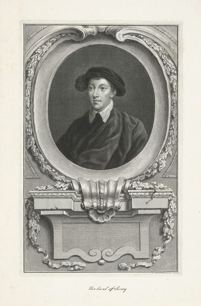 Editor: Here we have Jacques Nicolas Tardieu's engraving of Bon de Boullongne. I'm struck by the use of line to create texture and form. What stands out to you in its composition? Curator: The oval frame is key. It isolates the figure, directing our focus to the interplay of light and shadow on Boullongne's face and attire. Note the symbolic tools of his trade—palette and brushes—held with a delicate precision. The lines vary from light etching to deep scoring. How does this range affect your perception? Editor: It gives the image depth and tonal variation, almost like a painting in monochrome. I hadn't considered the oval frame to be integral to its structure. Curator: Indeed. By understanding the relationship between line, form, and frame, we gain a richer appreciation for Tardieu's skill.