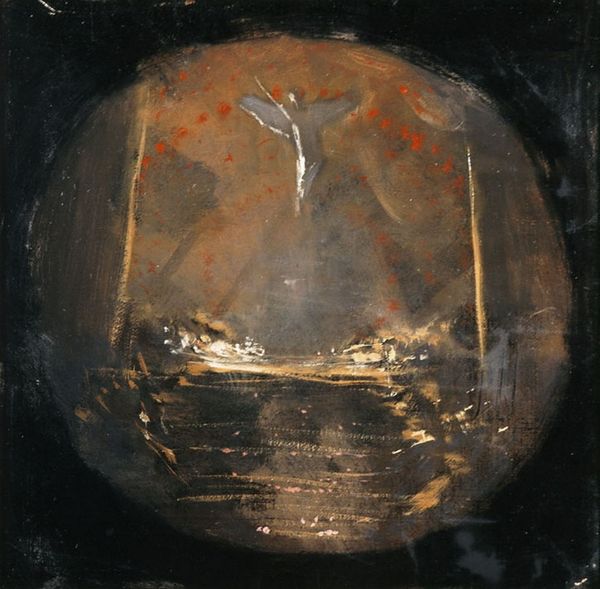 Curator: Here we have David Lynch's "A Figure Witnessing the Orchestration of Time" from 1990, primarily an oil-paint and matter-painting on canvas. Editor: My first impression is… murky. Like looking through swamp water. A really dark palette. I notice that impasto is deployed, but it struggles to offer some hope with its textural materiality. Curator: Murky, yes, I'd agree, that resonates strongly with his style. But there’s also a really fascinating tension at play. Figurative elements battle against this abstract expressionist approach. Editor: Speaking of abstraction, the materials used… the oil paint combined with whatever 'matter' comprises those textures… it creates a sense of… of primordial sludge. An unsettling origin. The use of such seemingly cheap materials is thought-provoking. There is labor condensed into the materials which reflects on the labor of film-making. Curator: Absolutely. This wasn't Lynch's primary creative avenue, but his paintings very much embody that same disquiet, and a particular sensitivity. The figure is witnessing this sort of grand… orchestrated moment. Are they observing the construction of the world? Or its decay? I lean towards decay, in this instance. It is haunting in some ways. The wire structure adds to this unease. Like a warped satellite. Editor: And it is all about layers. You know, Lynch's use of found objects and this combination with painting – he’s actively blurring that boundary between traditional painting and some kind of low-grade construction. I cannot say this looks especially carefully laboured, in the sense that you or I would imagine oil painting. What it shows is his concern with process and transformation. Curator: Very much so, process, I think that sums it up well. We are all both witness and agent in these moments of temporal flux. "A Figure Witnessing the Orchestration of Time" encourages that moment of recognition of the strangeness, or the marvel, in those everyday intersections. Editor: Yes, the work makes one ask questions about value. Value of time, value of materials. Lynch uses cheap means to access some profoundly dark imaginings, while elevating it above something like horror through gesture and form. It becomes... valuable through a different logic.