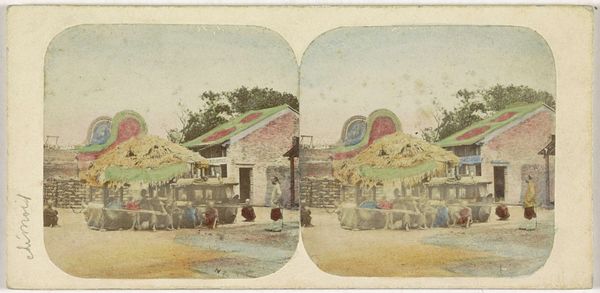 Curator: This daguerreotype print, tinted with watercolour and coloured pencil, offers a view of “The Temple of the Five Genii…” in Canton, some time around the 1850s or 1860s. The photographer is Felice Beato. Editor: It’s beautiful, but also strange – the light, the flatness, gives it a ghostly quality, as if these buildings are memories of themselves. The parallel presentation as a stereo card enhances this uncanny sensation. Curator: Note how Beato uses the stereoscopic format to emphasise the architectural details of the temple. The repetition and slight shift in perspective invites our eye to consider symmetry, repetition and pattern throughout the whole image. Editor: The roof decorations, those almost comical figures lining the eaves, surely hold significance. The temple must have resonated deeply within the local community—five Genii! It hints at a pantheon, layers of spiritual beliefs interwoven with daily life. Curator: The hand-colouring softens the rigid geometry captured by the daguerreotype. Observe the chromatic choices, particularly the reds and greens against the washed-out white walls and faded blue doors—an attempt, I believe, to create a sense of harmony within the representational structure. Editor: Absolutely. Colour adds an emotive dimension—red for good fortune, perhaps? Those vibrant hues contrast starkly with the muted tones of the building itself. They bring those spiritual aspects forward, offering a glimpse of the ritual significance, an emotional resonance that would otherwise be lost to us today. Curator: The very format of a stereo card points to nineteenth-century desires: to grasp an 'authentic' three-dimensional impression of foreign lands, a form of visual possession driven by curiosity, but one also steeped in the Orientalist tendency toward generalization and romanticism. Editor: Do you think the way this medium lends itself to capturing sacred spaces offers a parallel to modern-day travel photography, with that quest to capture not only 'what we see,' but the ‘feeling' of being present somewhere special, embedded within a place that resonates deeply? Curator: It offers insight, but through the lens of Western perception, a constructed impression no less valid, but inherently bound to its historical context and to its internal structural system. Editor: I agree, still it serves as a compelling record that embodies not only documentation, but evokes our innate fascination for bridging cultures and connecting with the symbols from faraway spaces. Curator: Indeed. An object of intersecting intentions, and through careful visual analysis, we discern at least a few. Editor: Well said. It leaves me pondering how places of worship are designed to trigger emotion.