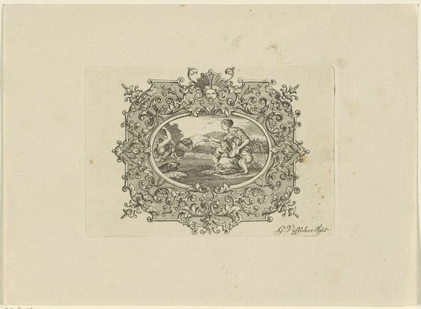 Abraham Delfos made this delicate etching, Allegory on Peace with Three Putti in Cartouche, in the 18th century. Etching is an intaglio printmaking technique, where a metal plate, traditionally copper, is coated with a waxy, acid-resistant substance called a ground. The artist then scratches an image into the ground, exposing the metal. The plate is immersed in acid, which bites into the exposed lines, creating grooves. The ground is removed, ink is applied to the plate, filling the etched lines, and the surface is wiped clean. Finally, the plate is pressed onto paper, transferring the ink and creating the print. The image's fine lines and subtle tonal variations display Delfos's skill, reflecting the labor involved in preparing the plate, etching the design, and printing the image. It’s a process that involves expertise, time, and physical effort, contrasting with today’s digital image production. Thinking about the work and the cultural and social context in which it was made reminds us that printmaking was an essential means of communication and artistic expression, long before photography and digital media.