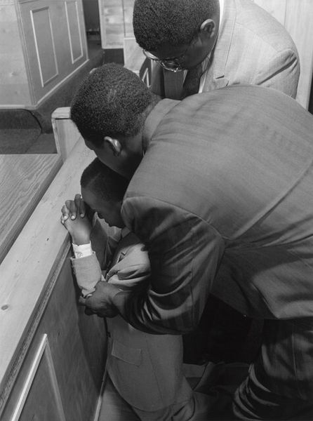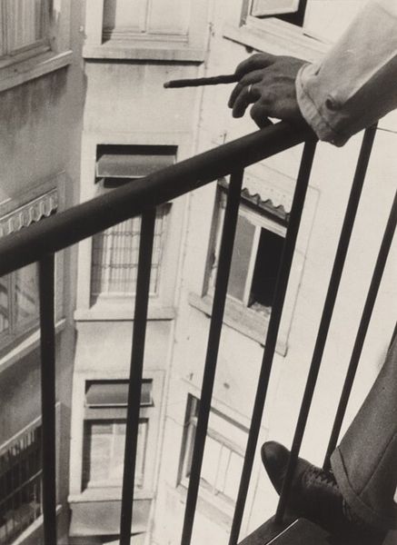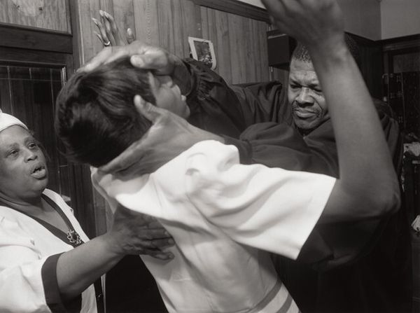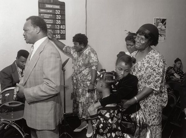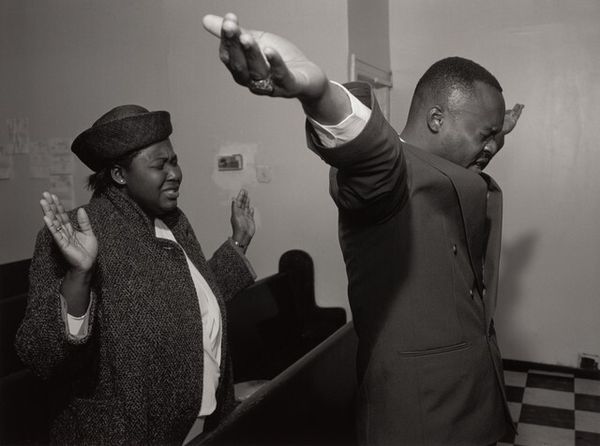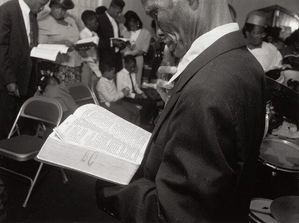 This is an Untitled photograph by Thomas Roma, printed on a sheet measuring approximately 11 x 14 inches. The picture is dominated by subtle gradations of tone. This feels right to me; like the different shades we see as light falls on a surface, nothing ever really looks *just* black and white, you know? The man in the suit is a study in contrasts. His dark skin against the pale jacket, his hands clasped together in front of him, while the other musician holds his sticks loosely. The whole image feels like an exercise in textural variation. Look at the sheen on the cymbal, so bright in comparison to the matte of the wall. It's a real push and pull between light and dark. You can almost hear the silence of the room before the music starts. This reminds me of Roy DeCarava, but with Roma's own twist. It shows that all artists, in a way, are in dialogue with one another. And maybe that's what art's all about, it’s an open conversation.