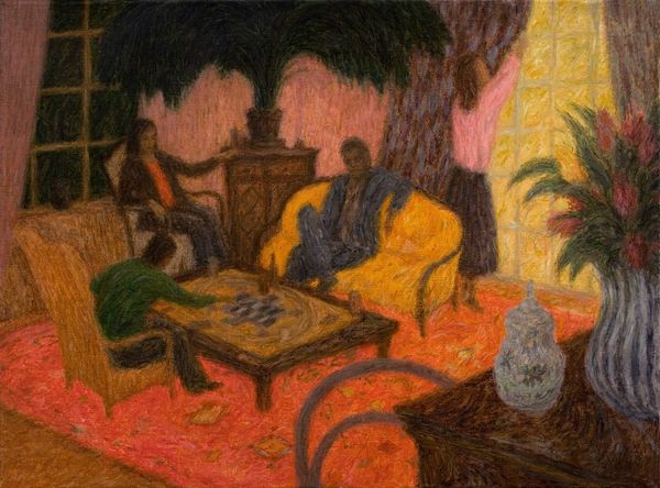 Iwo Zaniewski's painting, "Game," presents us with an intriguing interior scene, its surface worked with visible, almost tactile marks. The composition, bathed in warm hues, centres around a group engaged in a board game, their figures rendered with a deliberate naivety. The artist employs a strategy of flattening the perspective, reducing depth and emphasizing the surface of the painting. This approach allows Zaniewski to explore the interplay between the figures and their environment in a more abstract way, almost as if the scene is a stage set. The colour palette, dominated by reds and yellows, creates a sense of intimacy and warmth, yet the overall effect is one of detachment. The artwork seems to be less about the specifics of the game being played and more about the dynamics of human interaction within a defined space. The visible brushstrokes and the simplification of forms invite a reading of the painting as a study of the essential elements of visual representation. Zaniewski thus invites us to reconsider how we perceive space, representation and the very act of seeing.
