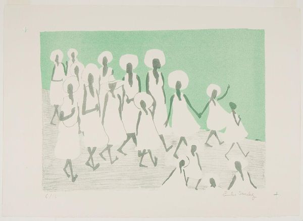 Curator: Emilio Sanchez’s graphic work, Negritas Pasendo, dating from around 1955, presents a study in simple form. Editor: It does possess a quietude, almost serene despite depicting so many figures in what seems like a procession. Curator: Absolutely, the reductive palette of light gray, white, and pale green enforces a formalist reading, the figures becoming shapes within the larger composition. Note how each figure’s clothing, represented in flat white, contrasts so sharply with the simplified gray form of the bodies. The composition has been expertly designed to balance color and void. Editor: While I appreciate your attention to form, one can't ignore the loaded implications here. The figures—dark silhouettes adorned in white, likely connoting specific historical roles in Caribbean or Latin American societies in the 50s—warrant an interrogation of class and colonial legacy. What does the anonymity signify, en masse like that, and why present only implied details, never distinctly portrayed? Curator: I interpret the abstracted forms as moving towards the universal rather than a representation of specifically-coded identities, focusing on basic shape rather than detail in a classic modernist trope. It appears influenced by cubism. The composition allows us to discern multiple perspectives without overwhelming us with minute descriptive features. Editor: Even abstraction occurs within history. Consider Sanchez's own background, his perspective in representing this cultural panorama. It provokes necessary discomfort. There's also a flattening in this image of identity through form, perhaps unconsciously mimicking societal imbalances present during that time. How does the light, both in color and implied direction, hit these simplified figures, particularly considering social structures that defined what their skin colors signified? Curator: I recognize your concerns, but it's also important to view artwork like this with an eye to its historical context as well as with the creator's individual concerns. His work suggests, to me, formal questions around flatness and perspective being worked out and given form. Editor: Understanding formal strategies certainly helps appreciate how art produces and circulates ideas. This approach only enhances rather than inhibits more radical interpretative efforts. Curator: Fair point. Thank you for guiding us into such thoughtful depths of discussion. Editor: The pleasure was entirely mine.