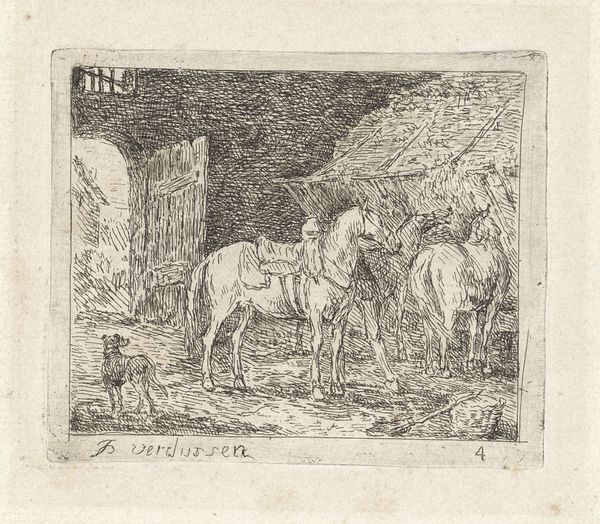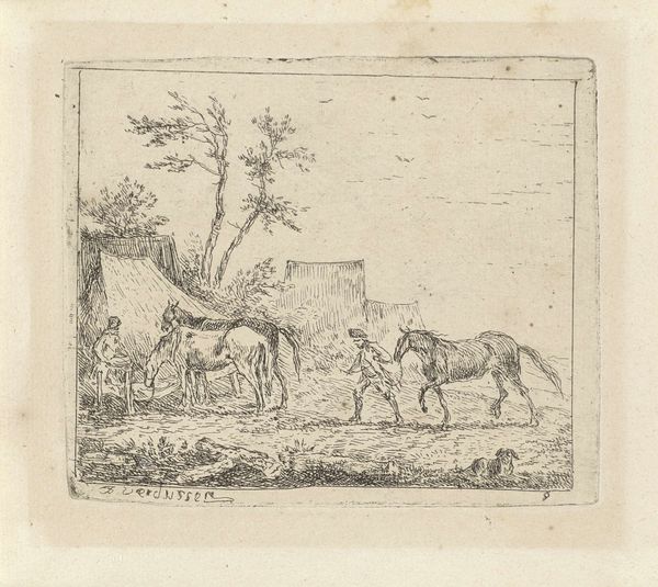 Curator: Let’s consider this drawing by Jan Peeter Verdussen, titled "Ruiter voor een huis, met figuren en een hond," created sometime between 1710 and 1763. Editor: My immediate impression is one of stillness, despite the implied journey suggested by the horse and rider. The fine lines create a sense of quiet observation, as though we’re glimpsing a fleeting moment. Curator: Absolutely. Verdussen places this genre scene—the rider, figures, and dog before the house—within a web of societal roles and visual cues. The horse, for example, historically signifies power and status. How does its presence speak to broader social hierarchies of the era? Editor: Well, the horse as a status symbol is an interesting entry point. Notice the dog at the bottom. Across cultures, the dog appears in heraldry, mythology, and folklore and frequently stands as a marker of loyalty, guardianship, and domestication. Here, the figures, animals, and landscape compose a layered snapshot of domestic life during that period. Curator: I agree. Considering this as a “genre-painting”, as its theme suggests, is useful. But let’s dig a bit deeper. Are the figures stock characters enacting familiar scenarios, or does Verdussen offer some social commentary? Editor: Perhaps both. We know that during the Baroque period, these genre scenes appealed to a growing middle class. In visual terms, Baroque sought dynamic movement, grandeur, and intricate detail to create spectacular, sensory experiences. Verdussen used humble ink lines instead of saturated colors. Still, by referencing established iconography—figures, dwellings, horses, dogs, etc.—the drawing gains familiarity. The images draw on pre-existing memories within our minds to enrich the moment. Curator: A critical reading reveals that seeming “ordinariness” as quite constructed, reflecting power dynamics in these ostensibly everyday interactions. For example, what do you make of the building being shrouded by an underlayment of diagonal line-work? Editor: That's very insightful. If the figures in the foreground present archetypes, or figures in allegorical procession, perhaps that obscured architectural reference in the background gestures to how institutions of authority begin to blur or erode during this time? It provides context, yet refuses to be explicitly definable, forcing the viewer to become complicit with a historical narrative. Curator: Precisely! This intersectional approach—examining how social identity markers converge in the drawing—offers insight into issues of identity, gender, race, and power present, even if subtly, within the drawing. Editor: I found it fascinating how, through seemingly simple strokes, Verdussen created a rich, multifaceted depiction with threads that tie into the cultural memory of its audience, centuries later. Curator: It serves as a reminder of how artistic expression reflects—and shapes—our understanding of societal and historical landscapes.