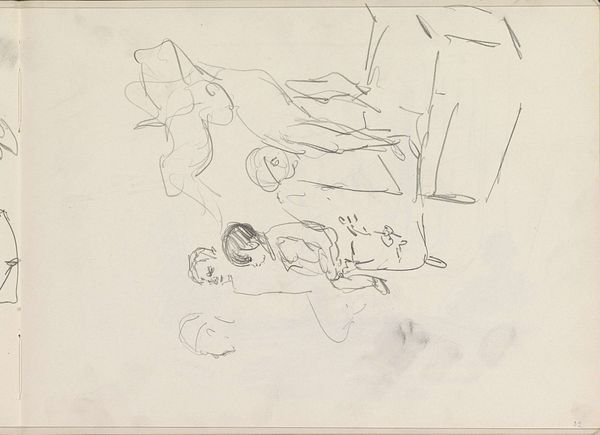 Wilhelm Busch sketched "Die gestörte, aber glücklich wieder errungene Nachtruhe (Der Floh)" with graphite and watercolour. The drawing presents a sleeping figure whose rest is disturbed, yet ultimately regained. Busch uses a minimalist approach, with quick, light strokes to convey form and emotion. The composition is simple. Dark hatching suggests the depth of night behind the sleeper. Light washes of blue and red hint at bedding and the figure's face, respectively. These colors, sparsely applied, draw our eye to the points of interaction and discomfort: the face possibly bitten by a flea. Busch’s structural choices – the loose lines, the limited palette – contribute to the work's sense of immediacy and intimacy. The sketch destabilizes traditional ideas of formal portraiture, instead focusing on a fleeting, private moment. We are invited not just to observe the figure but to empathize with the universal experience of restless sleep. The drawing operates within a framework of observation of mundane experience, using form to access deep emotional and psychological truths.