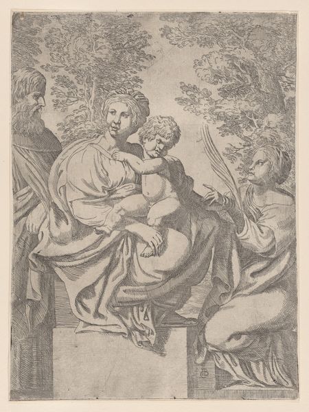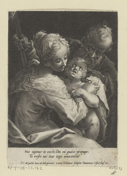 Curator: This print, titled "Maria met Kind," attributed to Lorenzo Loli, dates somewhere between 1622 and 1691. The piece presents us with an intimate portrayal of Mary and the infant Jesus rendered with fine engraving techniques. Editor: The linear quality immediately strikes me. There's a delicate fragility to the pen work, especially in the drapery folds. It feels tender. Curator: Indeed. The Baroque period, even in printmaking, was deeply connected to specific social and religious contexts. This image likely served devotional purposes, perhaps circulating amongst a particular religious order or a pious individual. Considering it is a print, what do you make of it? Editor: The formal choices—the lines creating the halo, the contrasting densities of line suggesting shadow—all work to enhance the image's ethereal quality. The materiality here is crucial. Curator: Yes, engraving requires specialized tools, artisanal knowledge, and significant labor. This would influence both the cost and accessibility of the image, thereby affecting its intended audience. Consider, too, the availability of paper and the economic structures surrounding artistic production at the time. It adds a complex layer, doesn't it? Editor: Absolutely. There is the interesting detail in Mary's gesture: her almost hesitant, very tender hand hovering over her son. Curator: The hand almost mirrors her gently inclined head! I'm curious: what meaning or reading do you infer from Loli’s stylistic choices and its implications? Editor: The relatively spare use of line focuses our gaze intently on the subjects' faces. And the halos further abstract, even de-materialize them. This is, in that sense, meant to represent the divine, not strict reality. The medium then itself helps elevate the message. Curator: Understanding the material constraints of early printmaking alongside the image's devotional purpose enriches our view of the labor and the beliefs of Loli’s time. Editor: Ultimately, it is how the basic material elements combine to create something transcendent, a poignant image that lingers.
