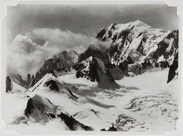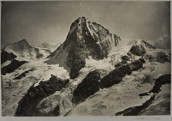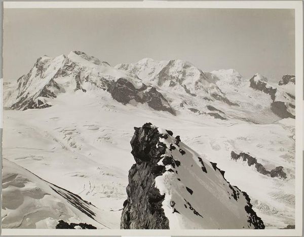 Curator: Vittorio Sella captured this striking image, "The Grand Combin from the Top of Mt. Tavé." It's a platinum print. The crisp detail is remarkable. Editor: There's something incredibly stark about it. It speaks to the sublime, but also the precarity of these landscapes as we consider ecological threats. Curator: Absolutely. Sella's work gained prominence in mountaineering circles but also served scientific expeditions, shaping the visual language of exploration itself. He showed us these landscapes. Editor: And that language is inherently tied to power dynamics, isn't it? Who gets to explore, who gets to define these spaces? The image, for me, raises questions about access and exploitation, but the stark beauty is arresting. Curator: Indeed. The framing, the stark contrasts, emphasize the monumental scale, reflecting a specific cultural fascination with the Alps at the time. Editor: It’s a potent reminder that even seemingly objective landscape photography is imbued with layers of cultural and political meaning. Curator: Precisely. A moment captured through a very specific lens.