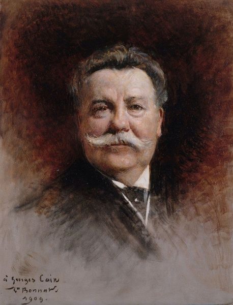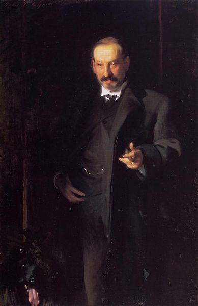 Editor: We’re looking at John Singer Sargent’s “Portrait of Louis Alexander Fagan,” painted in 1893 using oil paint. I find the composition striking; there’s a captivating sense of realism mixed with the intimate gaze of the subject. What draws your eye in this painting? Curator: Note the interplay between light and shadow across Fagan's face and suit. How do these modulations of tone create form and volume, defining the structure of the portrait? The application of paint, particularly in the impasto of the facial features, does it strike you as being used to primarily describe, or to create an autonomous surface, existing almost independent of the depicted figure? Editor: That's fascinating! It’s almost as if the paint itself is becoming another layer of texture and expression. I hadn't thought about the brushstrokes so much, focusing mainly on the face. Curator: Precisely. Consider the cool, muted palette; observe how Sargent manipulates the tones to evoke a sense of refinement, yet also creates a reserved distance. Does this reserve lend a formal stoicism to the sitter or do you see a psychological distance forming between the man and the viewer? Editor: I think there is stoicism in how Sargent renders the man’s composure but also a sense of introspection because of that slight distance you mention. So, the coolness doesn’t necessarily mean coldness in terms of emotion, but it functions on the level of form and composition to create an emotion? Curator: Precisely. Editor: That helps me see how the seemingly disparate elements contribute to the whole. Curator: Agreed. Reflecting on the composition and brushwork certainly enriches the understanding of Sargent's skill.