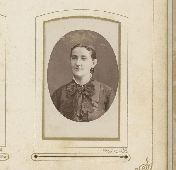 Curator: Right, so, this is a photographic portrait, believed to be created by Theodor Bässler sometime between 1860 and 1900. The artwork, known as "Portret van een jonge vrouw met halsketting"—that's "Portrait of a Young Woman with Necklace" to you and me— showcases an oval sepia print of a young woman. Editor: My first thought is one of melancholy, I'd say the overall tone is a soft yet insistent sadness. Something about her direct gaze combined with the faded quality of the photograph evokes a profound sense of nostalgia for a time and person I've never known. Curator: Interesting. I see a certain strength in that gaze too. The simplicity of the composition, almost clinical in its realism, serves to highlight the individual. And those details, like the frilled neckline and the delicate pearls...they feel very telling. Editor: Oh, absolutely, and those details speak volumes about social standing and perhaps the restrictions placed upon women of her era. We’re talking about a time steeped in Victorian ideals. Those pearls aren’t just an accessory, they're a marker. A carefully curated symbol. Curator: Right. Photography at this time was gaining prominence, becoming increasingly accessible, which opened up portraiture to the rising middle class. Suddenly, you didn’t have to be nobility to have your likeness captured. Do you think there’s anything radical about how she's portrayed? Editor: Radical? Perhaps not overtly. However, the very act of a woman existing in the public sphere—even through a photograph—could be seen as a subtle act of defiance against the Victorian expectations of domesticity and subservience. It’s a form of claiming space and visibility. It says: "I am here, I exist." Curator: It's strange how, through something as ostensibly simple as a portrait, one can catch glimpses of rebellion and constraint coexisting, isn't it? The formal pose, the restrained clothing... yet that defiant gaze pierces through it all. It's the tension between the presentation and what lies beneath that fascinates. Editor: Absolutely, and perhaps it's that very tension—the push and pull between societal expectations and individual identity—that allows this seemingly simple portrait to speak so powerfully to us across the ages. It resonates even now, in an era of filtered selfies, as an assertion of presence in the face of often oppressive expectations.