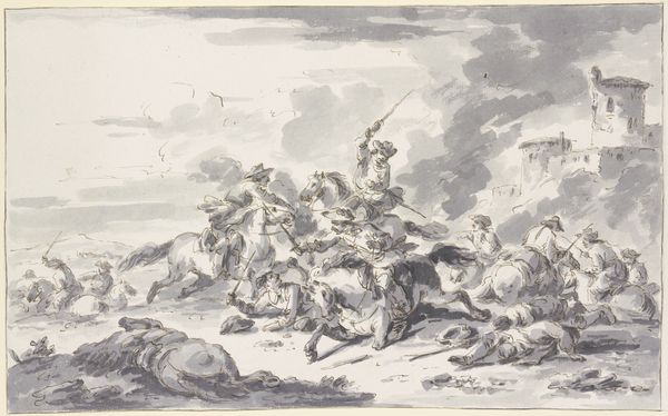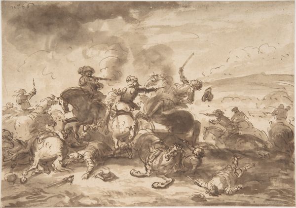 Curator: This etching by Johann Wilhelm Baur, completed around 1641, is titled 'The Death of Orpheus, from Ovid's Metamorphoses'. It's currently held at the Metropolitan Museum of Art. Editor: My first impression is the stark contrast—a lone, serene figure on one side and then a chaotic jumble of figures on the other. Curator: It really captures the moment of Orpheus' demise, reflecting a breakdown in social order through the depiction of violence enacted by a group of women against this solitary musician. How interesting it is to consider how interpretations of Orpheus have shifted over time, sometimes representing homosexual desire or liminal artistry. Editor: You can really see Baur's handling of line in this piece, particularly when focusing on the weapons and limbs. The process itself seems like a violent scratching into the metal of the plate. What’s interesting is that such delicate lines were created to convey this rather brutal act. The material contradicts the scene depicted. Curator: That contradiction makes sense when considering that stories from Ovid often function as critiques of power and explore themes of gender-based violence, or acts of punishment that seem almost… theatrical. How are we meant to understand our role as viewers, encountering such brutality? Are we meant to question what incited this violence against Orpheus? Editor: Right, this work asks questions about the raw materials and conditions—even labor—necessary to tell tales that implicate the audience in considering these themes. In thinking about the work's material history, one wonders if Baur faced any specific challenges while producing the original plates and if that process added anything further to the scene portrayed here. Curator: Thinking about Orpheus and his role as a figure often read in connection to art's power reminds me how complicated any discussion of power always becomes. Who has it? Who abuses it? The female figures here, for example—we should see them not just as symbols of rage but as people responding to systemic challenges. Editor: Indeed. This image reveals so much about Baur's material treatment of the page. It's fascinating to see how art functions as both artifact and narrative tool, conveying information about production and societal views. Curator: Absolutely, and analyzing it with these intertwined considerations offers us deeper insights. Editor: I agree, seeing it this way truly illuminates how complex stories manifest within a particular time.