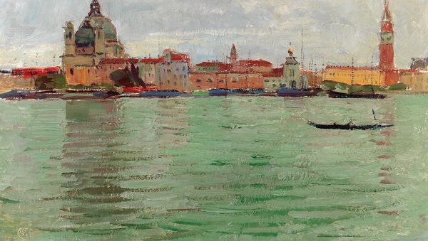 Editor: Terri Kelly Moyers’ "Pink Lanterns of Venice," painted in 2012 using oil paint, presents such a classic view, and yet the atmosphere feels so muted, almost melancholic. What's your read on it? Curator: This piece strikes me as a commentary on the enduring power of iconic imagery. Venice is so heavily depicted, commodified even, that Moyers seems to be acknowledging that weight. Note the diffused light, the subtle color palette. How do these choices shape our perception of a well-worn subject? Editor: They definitely take the edge off of the usual postcard-perfect view. It almost feels like a critique of tourist expectations. Curator: Exactly. The Impressionistic and Post-Impressionistic styles are, by 2012, deeply embedded in the visual language of tourism. Does Moyers employ these techniques to celebrate Venice, or perhaps to question the contemporary experience of the city as a cultural commodity? How might the "pink lanterns" factor into this interpretation? Editor: Interesting. So, those lanterns, usually symbols of romance and old-world charm, maybe represent a kind of staged authenticity for tourists? Curator: Precisely! The pink, a delicate color, against the somewhat somber cityscape – does it highlight the artificiality inherent in curated travel experiences? Editor: That’s given me a lot to think about. I originally saw it as just a pretty picture, but now I’m seeing layers of commentary on the way Venice is presented and consumed. Curator: Art holds power not just in what it depicts, but how it invites us to question our relationship with those depictions. It's great to unpack these things!