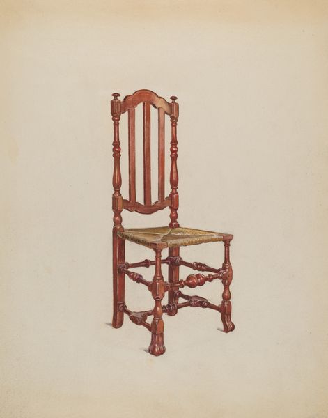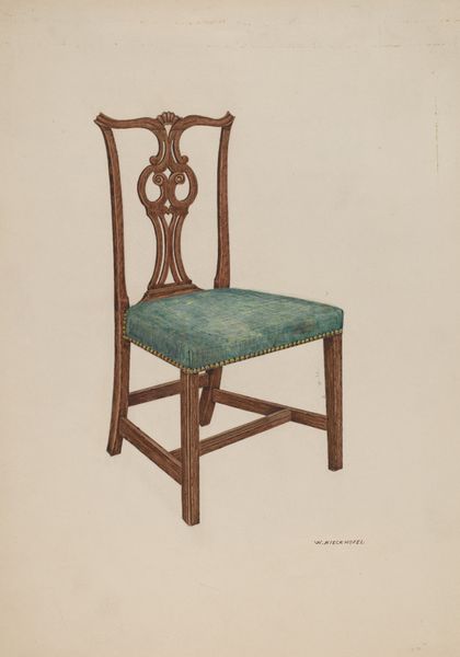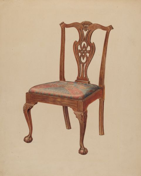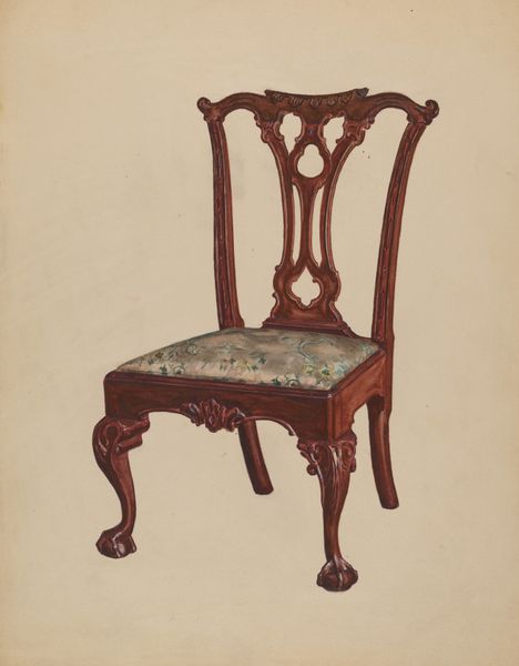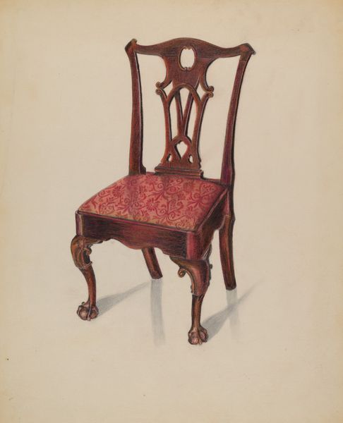 Curator: I am struck by the contrast between the simplicity of the form and the richness of the fabric in this artwork. Editor: I'm immediately drawn to the floral patterning, there's something comforting in these colors, although a bit muted in tone. It evokes a certain nostalgia. Curator: Indeed, this is "American Chair with Turkey Work" from 1936 by Victor F. Muollo. It appears to be a drawing, likely in pencil and colored pencil. Editor: Turkey work! That term suggests exoticism and luxury—though I'm guessing that this piece references historical styles more than actual imported textiles. What can you tell me about "turkey work"? Curator: "Turkey work" typically refers to a type of pile rug or upholstery imitating Turkish carpets that were popular in Europe, particularly during the 16th and 17th centuries. They represented luxury and a connection to the Ottoman Empire. Given that this image was created in 1936 it probably illustrates the way that elite designs gradually find their way into the popular designs and cultural memory of different social groups. Editor: It is fascinating how historical styles are reinterpreted over time, carrying cultural memory. Even this color palette of indigo, red, and muted green calls forth a deep feeling. There's something familiar about the shapes of the blooms, aren’t there any obvious meanings here? Curator: The presence of specific symbols within the floral design isn’t explicit here. What truly marks the value is the visual style with references to luxurious tastes through the choice of subject. It brings a sense of the past to contemporary audiences. Editor: I agree. The real symbolism might reside in the cultural cachet that an item evokes over the course of time! It's about class and tradition. The execution may be simple, even humble, yet the symbolic references within connect the audiences through space and time. Curator: Yes, the medium further influences my analysis; it is not a chair from that period, but rather a later drawing of that design which emphasizes an attempt to engage with ideas about "the past." This object embodies how those traditions became accessible or relatable, and were reshaped, democratized. Editor: Considering how powerful simple colors, composition, and reference can be, my impression is that such a modest creation can evoke a deep well of time, connecting different styles and memories through just one item. Curator: Absolutely; examining a drawing from the 1930s gives us insights into social relationships with domestic art at that specific time in American cultural history.