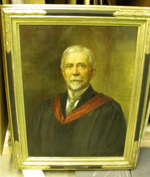 Editor: Blanche Ames Ames painted "Oakes Ames (1874-1950)." It’s quite large, over four feet tall! The sitter seems very distinguished in his academic robes. What symbols strike you in this piece? Curator: The robes themselves are powerful symbols of status and tradition, linking Oakes Ames to a lineage of scholarship. Notice the subtle repetition of forms – the curves of the chair echo the draped stole. How might these elements contribute to the cultural memory Ames wished to project? Editor: It seems like a carefully constructed image of scholarly authority. I hadn't considered the chair's curves adding to that impression. Thanks! Curator: Indeed. By engaging with these visual cues, we start to uncover layers of meaning embedded within the portrait.