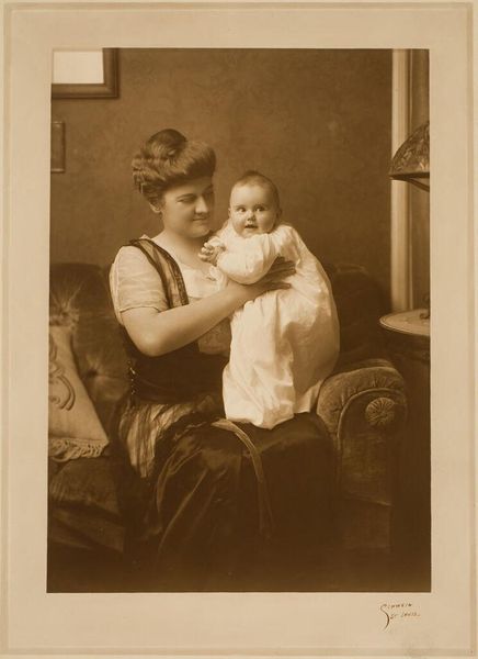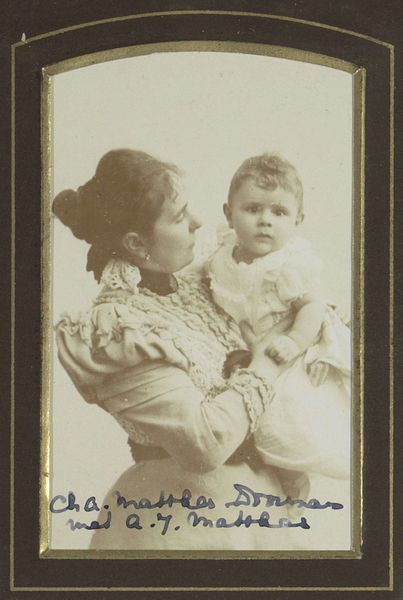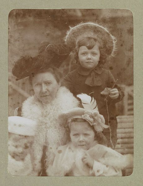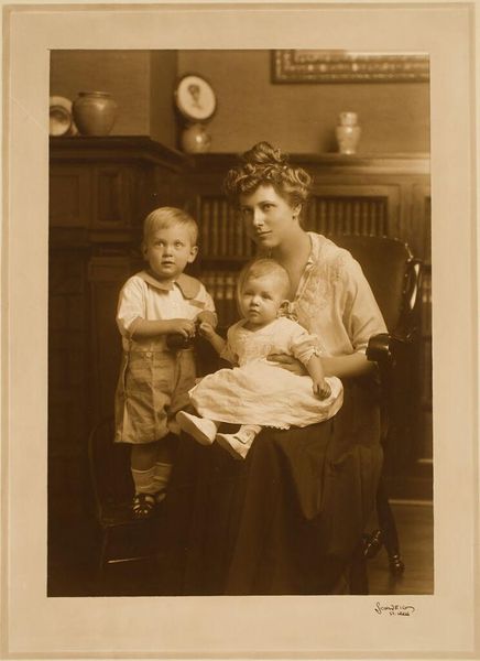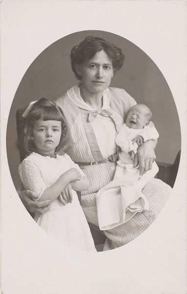 This photograph, titled Portret van Oma Boelen met Henk en Eva, captures a moment in time with the new technology of photography. Although the photographer is unknown, the image speaks volumes about the social context of its creation. Photographs such as these were made using chemical processes to fix an image onto paper. While not unique to the fine arts, the development of photography certainly disrupted traditional painting practices. It democratized portraiture, making it accessible to a wider segment of society. The rise of photography studios created new forms of labor and business. Consider the textures and details captured in this photograph - the soft fabric of the children's clothing, the patterned wallpaper in the background, the ornate chair with the decorative carvings. These were all physical markers of the time, captured through the medium of photography. By looking at this family portrait, we can understand photography's influence on art, culture, and the representation of identity, blurring the lines between everyday life, fine art, and commercial industry.