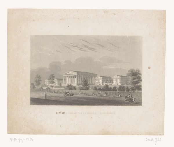Editor: This is James Steele's "Girard College for Orphans, Philadelphia," and it's a print. The architecture is so imposing, almost severe in its symmetry. What strikes you about its composition? Curator: The engraving technique creates a fascinating interplay of light and shadow. Notice how the linear precision emphasizes the geometric forms, almost turning the scene into an abstract arrangement. Consider the horizontal bands—sky, architecture, ground—how do they contribute to your reading? Editor: They seem to emphasize the college's separation from its surroundings. It feels very self-contained. Curator: Precisely. The formal structure reinforces a sense of order and perhaps even isolation. Does this reading alter your initial impression? Editor: It does. I see the careful composition as highlighting its institutional purpose. Curator: Indeed, form and function intertwine to create meaning.