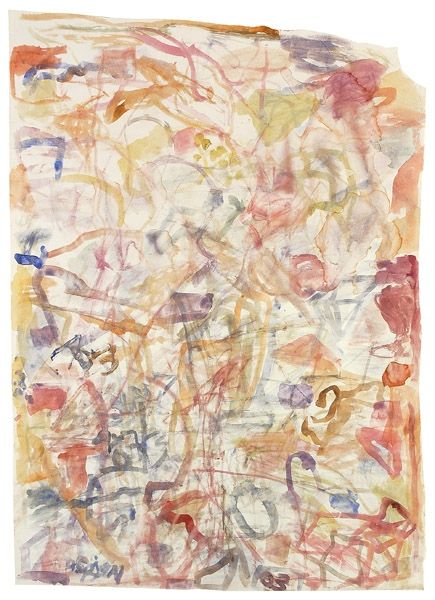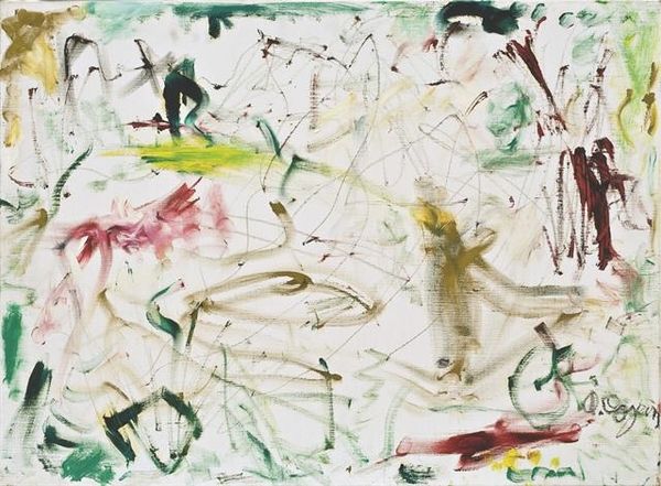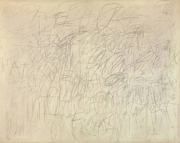 Curator: Right, let's dive into this one. Here we have Cy Twombly's "Sunset" from 1957. It's ink and charcoal on paper. Editor: My first thought? It feels incredibly vulnerable. All those scratchy, pale marks on the white...almost like whispers on the verge of disappearing. Curator: That’s interesting. When I look at it, I see a real rawness, like Twombly was trying to capture not just a sunset, but the fleeting feeling of a sunset, you know? That moment of pure emotion. Editor: Definitely, but the emotion feels filtered through a lens of post-war anxiety. This was the late 50s—a period grappling with collective trauma and existential questioning. I wonder if those fragmented lines are somehow mirroring that feeling of societal fragility? Curator: Perhaps. He was definitely plugged into that zeitgeist. I see a connection, too, between those scribbles and graffiti—a kind of primal urge to mark territory, to exist. It almost looks like he's exorcising something onto the page. Editor: Right. And who gets to "own" beauty anyway? Sunsets, often romanticized, can also represent something deeply inequitable depending on where you're standing and who you're standing with, so in my opinion this can relate to colonialism and class divides. Curator: Hmmm, maybe. To me, the calligraphic quality—it's almost like he's writing light, or the echo of light. A love letter perhaps? Albeit a cryptic one. Editor: It could be read as subversive. Calligraphy, historically a practice linked to power and religious text, being intentionally "defaced." I see the dismantling of tradition. Curator: Whatever the interpretation, I find something beautiful and enduring in this chaos. Editor: Yes, even with all its anxieties, I can see a quiet beauty.