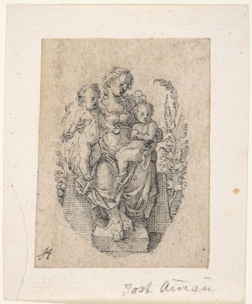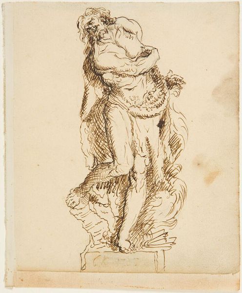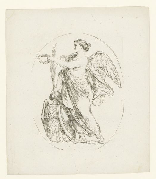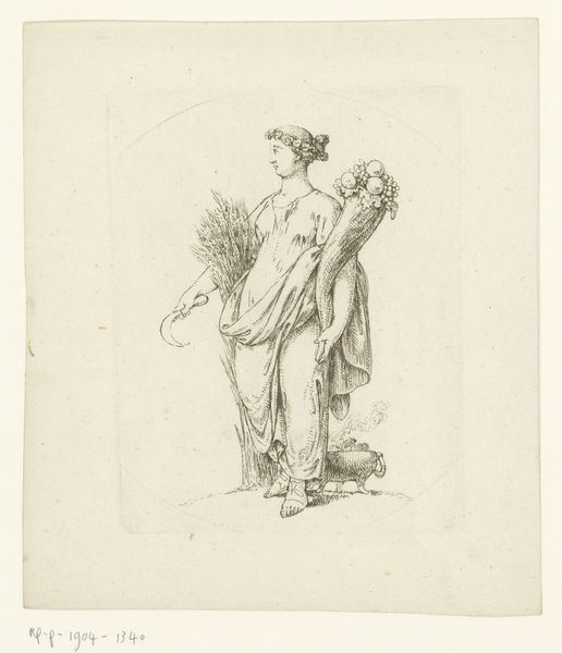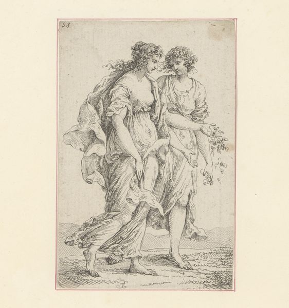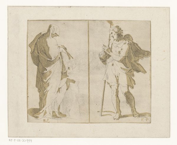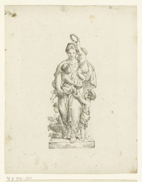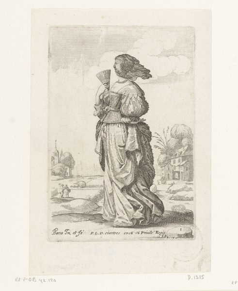 Curator: What captures my attention immediately is the vulnerability; the etching of "Standing Woman" created in 1637 by Hendrik van der Borcht II. There's such fragility rendered by those delicate lines, and currently in the collection of the Rijksmuseum. Editor: It feels incomplete somehow, a figure emerging from nothing. Is it a lack of context that gives that feeling of suspended narrative or is it meant to be ambiguous? Curator: Ambiguity definitely feels like part of the point, I think. See how van der Borcht uses the intaglio to build up the darker values and her flowing drapery; it gives this floating quality to the female form. The piece definitely invites us to fill in the blanks with our own emotional response. The figure seems less concerned with conveying a moral tale, and more about capturing a feeling. Editor: The drapery evokes the swirling clouds around allegorical figures; there’s that Baroque drama, but subdued. But if we dig beneath the Baroque drapery and classical form, doesn’t the very act of rendering a nude, standing figure in this way carry its own symbolic weight? Think of the history of representing women in art—often laden with moral judgment, religious significance or, sometimes, purely decorative. Curator: It’s tempting to go there, but I also wonder if it’s possible that this is just someone existing, without needing to stand for something larger. Can a nude simply be? Editor: Perhaps. Yet I am still captivated by what is absent in this print: what's in her gaze, her thoughts as she looks away, the absent story; but also what our perspective reveals about us when we fill it in. It really underlines the image's power to transform and to reflect its audiences. Curator: Right. It's really as if Van der Borcht wanted to explore feeling instead of making an instructive point—leaving it open for anyone to simply…feel. That's a gift. Editor: A gift indeed, one that allows a unique interaction each time. Thank you for guiding us through this artwork!