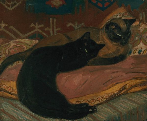 Curator: Frederick George Cotman created this watercolor painting titled "Tucked Up" in 1904. It's primarily a portrait of a dog nestled in some bedding. Editor: Oh, it’s cozy! There's a sense of gentle domesticity that is immediately appealing. But also something melancholic in the dog's eyes. Curator: Absolutely, the image evokes sentimental feelings, like a visual representation of "creature comforts". The tucked-up dog serves as an accessible symbol for care and nurturing. Editor: Given its date, I can't help but read it in light of the massive shifts in social structures happening at that time. This kind of sentimental portrayal served to idealize domestic life, maybe even as a buffer against rapid change. It certainly makes me wonder who within Cotman's circle may have been comforted or represented by the pet. Curator: That’s insightful. The composition is pretty standard, the subject matter common and timeless. There is something essentially relatable here - animals have always offered humans companionship and acceptance. This feels particularly true for the upper and middle classes, especially at a moment when increased consumerism made keeping animals an indicator of wealth. Editor: Also note the plant in the background! Even the botanical arrangement emphasizes the cultivated interior. This is about crafting not just a living space but also a vision of societal harmony reflected in that small domestic scene. Curator: That harmony also finds form through his masterful rendering of light. The warm hues highlighting the dog against the blue fabrics creates an emotional intimacy. These familiar forms and objects remind me that animals have long been symbolically equated to love and devotion. In ancient mythology, dogs serve as spiritual protectors... Cotman offers a more secular variation of these notions here. Editor: I agree; there's no specific narrative element, making the reading broad enough to evoke feelings about any lost and lonely figure. But the dog’s status as property means that the artist also has a moral obligation to raise concerns about animal treatment, reflecting turn of the century sentiments on animal rights. What feels homey to us now was actually once a powerful commentary on turn of the century England's rising consciousness around class status and property. Curator: I hadn't considered that connection to animal rights directly, but you’re right; it resonates within shifting Victorian values that eventually evolved to modern legal standings for animals today. Editor: Exactly! So, we can see "Tucked Up" both as a comforting portrayal of domestic life, and, unexpectedly, a mirror to evolving cultural ethics during its era. Curator: So much for granted is actually complex when examined with a view towards social context! Thanks!