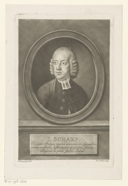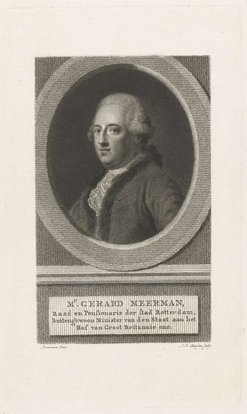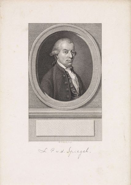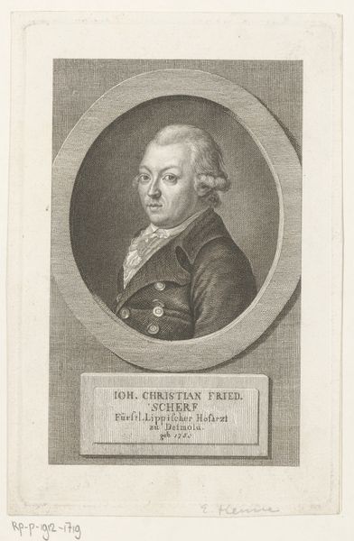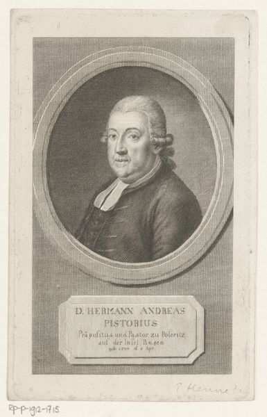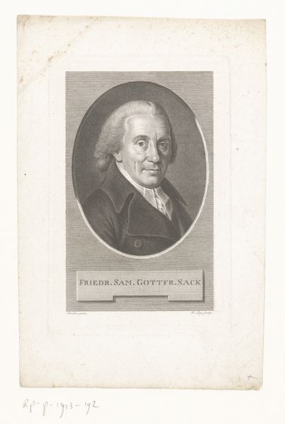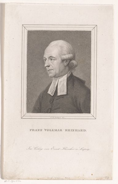 Daniel Beyel created this print of Ernst Ferdinand Klein using etching and engraving techniques. It is an artifact of its time, enmeshed in the social and political context of the late 18th and early 19th centuries. Portraits like this one are not just depictions but performances of identity. Klein's portrait, with his composed demeanor and formal attire, suggests a man of status and intellect, fitting for someone who was a professor of law in Halle. This image reflects the prevailing social hierarchies where one’s status was closely linked to their representation, yet we might also consider the emotional or psychological dimensions of the subject. What does it mean to have your likeness captured and presented for public consumption? How does it feel to be rendered in a way that both reflects and constructs your identity? Ultimately, this print invites us to consider the complex interplay between identity, representation, and social status in the context of the Enlightenment era.
