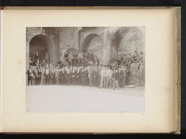 Curator: Looking at this fascinating albumen print, entitled "Onbekende personen met paard met wagen bij een poort" – "Unknown People with Horse and Cart by a Gate"–dated before 1920, what’s your immediate impression? Editor: There's an interesting, almost cinematic quality to it, wouldn't you agree? It reminds me a bit of early documentary filmmaking; a glimpse into everyday life that feels very authentic. Curator: Absolutely. The materiality of the print itself, with its characteristic sheen and subtle imperfections, adds to that feeling. The albumen process, a common technique at the time, involved coating paper with egg white, which creates this particular glossy surface. Consider the effort, the sheer labor, involved in producing a single print like this in that era. The photographer, Donald Mennie, must have intended this photo to speak about people's routine. Editor: It speaks volumes about the societal context. Note the people and their interactions framed within the architectural structure; the archway. It becomes a stage, highlighting the socio-economic dynamics of the time, perhaps reflecting a controlled movement, suggesting some socio-economic dynamic at play, who passes through that arch and why? Curator: Indeed, the frame of the arch acts almost like a proscenium. Given the realities of photographic processes then, one can see it staged even it if attempts to display an innocent view. Do we interpret that movement as labor, travel or trade? I see a distinct interplay of the manufactured and the organic materials, from the brick arch to the flesh of the animal; they contrast. I would like to dig deeper to the materials being exchanged in order to further the discussion of power structures within society at the time. Editor: That relationship with power makes the image very engaging. Considering the album context suggests intended reception, it's also important to consider how images like this might have shaped public perception of different cultures and societies. The power of representation, who controls it, and who gets represented are all fundamental aspects here. Curator: Yes, definitely. Mennie’s work and process force us to reconsider these assumptions about art versus documentary, or even staged-documentary and how that impacted not just the time's economy but also what gets produced afterwards. Editor: It all circles back to power—in imagery, technology, and historical record. A complex thing for one photograph to provoke! Curator: An incredible image that showcases more than the mere representation within. Editor: Agreed; much more than first meets the eye, prompting discussions about image-making power dynamics that continues today.
