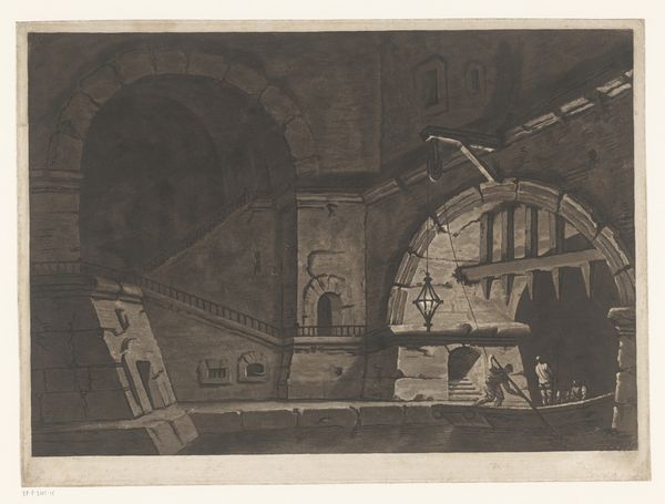 Editor: Here we have a drawing entitled "Grabgewölbe mit einer Pyramide" which translates to Burial Vault with a Pyramid. It appears to be created with ink and colored pencils sometime in the 18th century. The sheer scale of this imagined architecture is what strikes me. How do you interpret this work? Curator: I see a fascinating convergence of anxieties and aspirations of its time. Consider the fascination with Egypt in the 18th century, fuelled by colonial desire and the appropriation of ancient cultures. This drawing, with its pyramid and hieroglyphic-like symbols, speaks to that moment of cultural appropriation, but it also presents us with reflections of power. The pyramid, a symbol of absolute authority in its original context, is placed within a European architectural setting, possibly Roman, hinting at an attempted synthesis, or even a claim to a similar kind of power. Editor: That’s interesting. I hadn't thought about it in terms of colonial desires. Do you think that impacts how we should view the artwork? Curator: Absolutely. It requires us to critically examine the gaze of the artist, the cultural context of the intended audience, and how power dynamics are visually represented and perhaps, perpetuated. Is the artist celebrating the aesthetic or co-opting its power? Moreover, whose stories are centered in this imagined space and whose are erased? Editor: So, by looking at this, what seems to be a beautiful architectural drawing, we can open conversations about cultural power? Curator: Exactly! Art becomes a lens through which we can analyze historical attitudes towards otherness and empire, inviting discussions on representation, appropriation, and the responsibilities that come with engaging with cultures outside of our own. Editor: Thank you. It definitely gives me a lot to think about. Curator: And hopefully, invites further questioning of how the past informs the present.