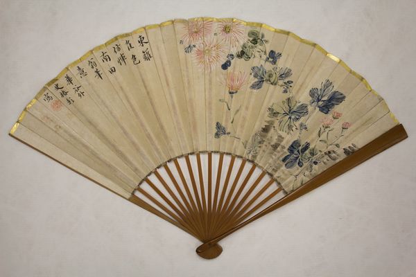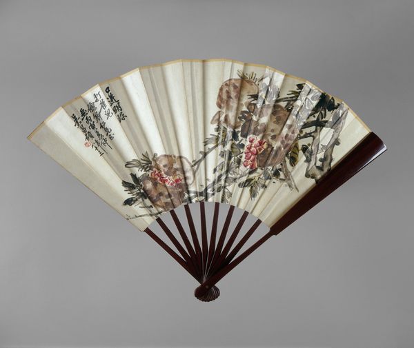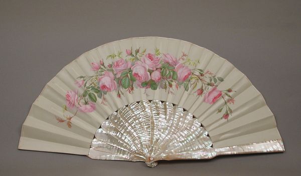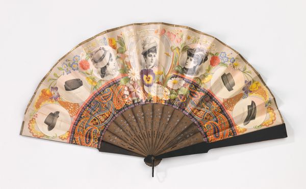 Curator: Oh, this is charming! "Souvenir de la Bénédictine," attributed to Louise Abbéma. Editor: It has this incredibly wistful quality, doesn't it? Like a daydream spun from old lace and the faintest aroma of liquor. So delicate, almost ephemeral. Curator: Well, consider its original function! As a handheld fan, it would have been a fashionable accessory. We should also think about how it positions Benedictine. Not just as a liqueur, but something that evokes a moment of elegance. The architecture of the abbey is presented in a painterly background, so we have setting as well as narrative and function. Editor: Right! There's a theatricality, too. The way the figure leans slightly off-center, gesturing towards... is that the abbey? Or just life itself? It reminds me of those dreams where everything is just slightly out of focus, gorgeous but you can’t grasp the details. Curator: Abbéma worked extensively in portraying the leisure class, particularly women, within changing societal contexts. I'm always thinking about these portrayals and how they fit with societal expectations. Fans also played a role in how people saw and understood these portrayals. Editor: Absolutely! It's marketing, but so much more than that. It's almost painting with perfume; advertising but through the medium of fine art. You feel drawn into that dreamy little world where everything is just a bit prettier than real life, a little more sophisticated. I wish I could taste that Bénédictine. Curator: The Art Nouveau aesthetic and hints of Impressionism would appeal to elite taste during this period of increasing leisure consumption. One has to assume that this fan made Bénédictine all the more desirable among affluent consumers. Editor: Thinking about this, these kinds of objects tell these interesting parallel stories: on the one hand it’s product advertising, but on the other it provides the tools for an evocative emotional experience. Curator: Precisely. That’s really the key here, isn’t it? The painting as an exercise in how public image intersects with artistic identity, and how societal expectation also meets consumer desire. Editor: Exactly! Okay, well, I’m completely ready for an absinthe and a fan of my own. Curator: Me too, or, maybe Bénédictine in my case! A fascinating lens into societal tastes and marketing ingenuity!