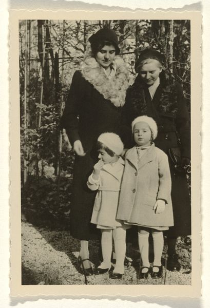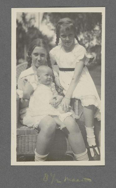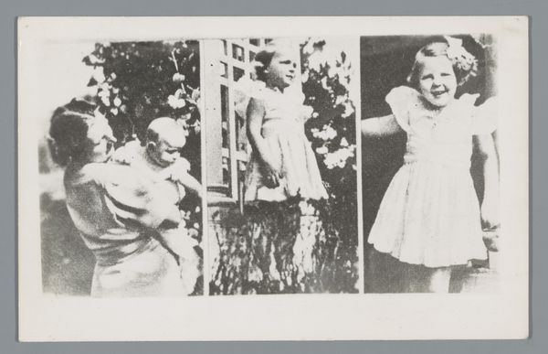 Curator: This gelatin-silver print, a reproduction of a newspaper article, shows Princesses Beatrix and Irene alongside Renée Roëll, photographed in Canada in 1940. The picture offers a seemingly simple moment of childhood innocence. Editor: Simple? Perhaps. Yet, seeing these young royals like this immediately stirs thoughts of privilege amidst a world at war. The innocent playdate in Quebec stands in stark contrast to the anxieties of Europe in 1940. Curator: Indeed. The image encapsulates a specific political moment: the Dutch royal family in exile. Understanding the institutional forces that frame the making and distribution of images becomes essential. Newspapers, like the one reproduced here, helped construct and maintain narratives of royal continuity and hope. Editor: Absolutely. And consider the gendered nature of the image. We see young girls, presented within a narrative of familial safety and innocence, implicitly contrasted with the masculinized spheres of war and politics, raising interesting questions about gendered expectations around leadership and nationhood in crisis. Curator: Furthermore, the act of re-presenting this newspaper photograph complicates its original context. A photograph of a photograph—it brings forth questions of authenticity, mediation, and the manipulation inherent to photojournalism. Editor: It’s intriguing, the way these young girls become stand-ins for national resilience. These small figures become heavy with symbolic weight, a theme that resonates even now, particularly around constructed image-making when understanding our society. Curator: It urges us to consider not just what is shown but also the socio-political conditions that led to its creation, circulation, and enduring relevance, the political symbolism embedded within the family dynamic and image. Editor: For me, this print serves as a potent reminder to resist passively receiving images. We are forced to constantly interrogate how images intersect with historical, political, and social contexts. It reminds me how the most seemingly benign image can embody incredibly powerful and coded messages.