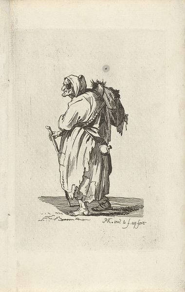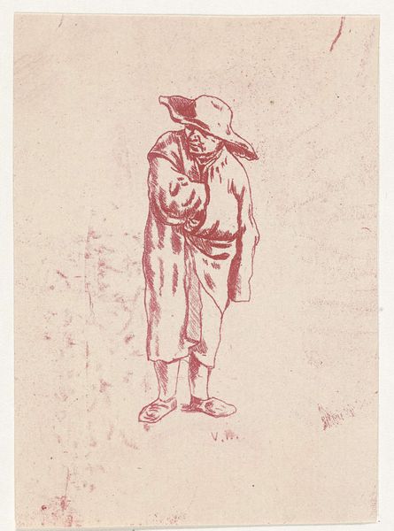 This is "Standing Woman with Knife in Hand," a drawing made by an artist known only as Monogrammist GT. It is rendered in pen and ink. The stark black lines on the pale paper create a dynamic contrast, capturing the woman’s form with an economy of strokes. Look closely, and you'll see that the ink varies in tone depending on the pressure of the artist's hand, imbuing the figure with weight and presence. The way the lines are put down is as important as the subject matter, the quick, confident strokes reflecting a society that increasingly valued efficiency and speed. The choice of ink, a readily available and relatively inexpensive material, suggests a context beyond the traditional art world. The artist is not working with precious materials like oils or bronze. Here, the act of drawing becomes a means of observing and documenting everyday life, reflecting the social and economic shifts of the time. So, it’s worth considering the wider context of materials, making, and labor in order to understand the artwork’s full meaning.