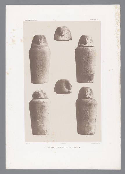 Curator: This is an image of “Vijf Apis-ushabti's en vier ushabti's, gevonden bij het Serapeum te Memphis,” a print created between 1852 and 1857. Editor: They have an interesting rigid design. Looking at the layout and monotone hues, it’s almost clinical, like a natural history study, even though they're sculptures from ancient Egypt. Curator: Well, these ushabti figures, discovered at the Serapeum, were far more than simple statuettes. The Apis bulls themselves were considered incarnations of the god Ptah, sacred animals imbued with potent spiritual significance. And the ushabtis were servants, stand-ins meant to perform labor in the afterlife for the deceased. They carry such weight in funerary practices. Editor: The visual encoding through the rendering has something clinical but it does offer a fascinating paradox of scientific detachment portraying intensely spiritual objects. The artist makes interesting use of the frame—setting a kind of grid which, rather than just ordering, seems to be subtly influencing my perception. Curator: I'm struck by how the varying iconography provides insights into ancient Egyptian cosmology. Some figures wear animal masks signifying protective deities and are associated with royal power, a connection to the divine realm meant to ensure the king’s transition to immortality. Note the placement of hieroglyphs on their bodies, it gives you some idea of the kind of formulas recited over them and inscribed on them. It speaks to identity, protection, and access to the afterlife. Editor: And this precise organization in this format presents an interplay of light and shadow enhancing the shapes, subtly, lending each a particular, well-balanced sculptural solidity. The print-making, or even the draftsmanship here, presents them like preserved specimens for dissection. The overall experience is very much informed by contrast between organic shape and controlled presentation. Curator: When you consider these images now, in our contemporary moment, this picture is speaking across millennia, from its moment of making to our moment of seeing. These little statues show a remarkable belief in magic. The print’s very existence echoes the themes of continuity that informed ancient funerary rites. Editor: Exactly! The visual language creates that echo. I’ll carry the way these contrasts play off each other with me, giving me much to continue exploring!