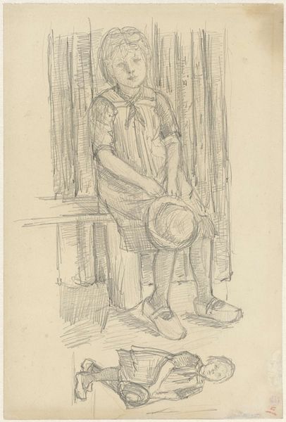 Jozef Israëls made this pencil drawing, "Standing Girl with Hat and Bag," sometime in the 19th century. It's a simple sketch, yet it evokes the social realities of the time, particularly the lives of working-class children in the Netherlands. Israëls was known for his paintings of peasant life in the Dutch countryside. He was associated with the Hague School, a group of artists who reacted against the grand, historical paintings favored by the art academies. They focused on the everyday experiences of ordinary people. Here, the girl's plain clothing and practical hat suggest a life of labor and limited resources. The sketch invites us to consider the social structures that shaped her existence. Historical records, such as census data and photographs, can give us more insight into the lives of children like her. Art like this serves as a reminder of the social conditions that shape artistic production and the power of art to challenge or reflect those conditions.