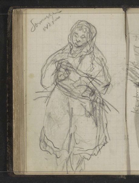 Curator: Here we have Louis Apol's "Portret van een Samojeed," a pencil drawing dating from about 1880 to 1888. It resides in the Rijksmuseum. What are your initial thoughts? Editor: The raw energy! It’s immediately apparent. Look at the quick, light strokes of the pencil. You can practically feel the artist capturing a fleeting moment, a face observed perhaps in passing. Curator: Absolutely. Notice the hooded figure, likely a member of the Samoyedic people, staff in hand. The quickness speaks to immediacy but it is intriguing when we consider the deeper implications this man's likeness held from a European perspective during that time. Editor: Right, the 'how' is important, isn't it? Pencil, paper, readily available. This isn't some commissioned portrait destined for a grand hall. It feels intimate, more akin to a travel sketch, part of a larger visual diary. A glimpse into the means of representation of a man on the go, creating a sense of adventure. Curator: Indeed. Apol traveled to the Russian Arctic, and it's fascinating to consider the symbolic weight of this image. What did the Samoyeds represent for a Western audience? Were they an embodiment of untamed wilderness, perhaps? Editor: Maybe! And looking closely, it is quite sketchy—clearly unfinished. Almost like a sample, made using easily accessible materials to explore quick options that were readily available during Apol’s travel and study. How fascinating! Curator: Precisely. Apol captures an 'exotic' subject and the sketchiness may have emphasized the man as ‘other.’ Even incomplete, it embodies a spirit of exploration, an attempt to classify and catalogue the world around him. Editor: Yes. Thinking about that labor… how quickly could Apol reproduce his sitter? This pencil drawing and the ease of distribution and reproduction suggests it’s very different from traditional laborious approaches to the oil portrait or painting that came before it. Curator: The image lingers in the mind, this pencil sketch. It's not just about what is depicted, but also the traces of a cultural exchange. Editor: Agreed. A tangible mark on paper, illustrating both artistry and labor.