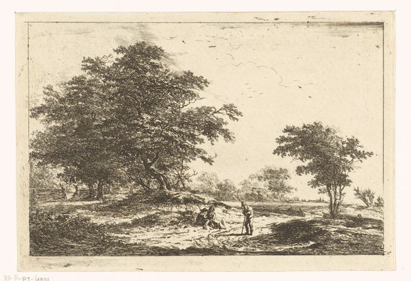 Franciscus Andreas Milatz made this landscape with trees and a rider on a road using etching techniques. The etching gives us a glimpse into the late 18th-century Dutch countryside, a time of social and economic change. The presence of a rider suggests a hierarchical society where land ownership and mobility were signs of status. Milatz was a student at the Haarlem Stadstekenacademie. This state art school was responsible for training draftsmen for trades and industries. It also stimulated art collecting and the development of art criticism. Note the way the artist carefully portrays nature, indicative of the era’s growing interest in landscape as a subject. The detailed depiction of trees and the atmospheric perspective evoke a sense of the sublime. This artwork invites us to reflect on the changing relationship between humans and nature during the Age of Enlightenment. By studying historical records and cultural contexts, we can gain a deeper understanding of its significance.