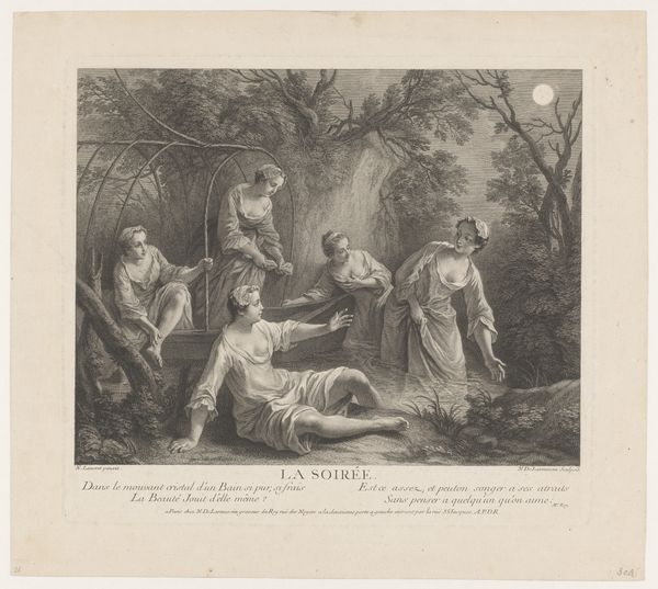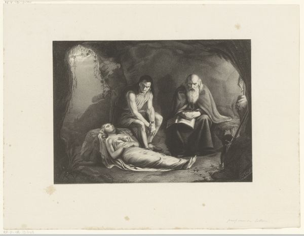 Editor: We are looking at Pierre Simon's engraving, "The Burial of Atala," likely created between 1779 and 1820. The Romanticism of this landscape contrasts against the sharp focus of the figures, and the whole intaglio feels very balanced in terms of light and dark. What do you see in the piece? Curator: I'm intrigued by the stark dichotomy presented in the image. The landscape serves less as a backdrop and more as a stage. Observe how the cave’s entrance frames a Romantic landscape of trees and graves beyond. Simon directs our gaze through carefully arranged pictorial space; dark foreground contrasting against bright background. Note the expert manipulation of light. What appears spontaneous and atmospheric belies the structural underpinnings. Editor: So, it's almost as if the outside is balanced with the inner scene through light and composition? Curator: Precisely. The subjects – Atala, her lover, and the priest – exist within a structured composition, note their arrangement as they direct the eye, rather than pure emotional expression. Their positioning, along with the formal balance between light and dark, contributes to the overall narrative effect within the medium of intaglio. It calls into question whether this is about the figures and subject, or if it’s a demonstration of an artistic problem well resolved. Editor: I'm beginning to see it in that light, the scene becomes almost a problem that he has solved through line and space. Curator: It highlights the engraving as an exercise in aesthetic arrangement, using the figures merely as compositional tools. The artwork becomes about formal control over emotional chaos, and challenges how we approach art-historical narrative. Editor: Thanks! I will consider how technical and structural elements may come together when thinking about art moving forward.