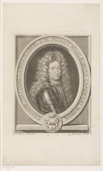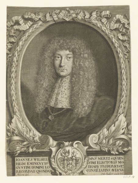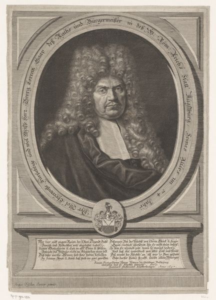 This is Moritz Bodenehr's portrait of Johann Sigismund Küffner, an engraving of great symbolic weight. Enclosed within an oval frame adorned with drapery, Küffner is presented with a coat of arms below, all potent symbols of status. Consider the oval frame, reminiscent of ancient Roman portraiture, evoking ideas of virtue and historical continuity. The elaborate drapery, casually yet deliberately placed, hints at theatricality and the subject's performative role in society. Then, the family crest, a symbolic synthesis of lineage, values, and identity, frozen in heraldic form. Such devices echo through art history. Think of the Habsburg emperors, each portrait a careful construction of power, their symbols meticulously chosen. These motifs aren't mere decoration; they are deeply embedded in the cultural psyche, resurfacing across time, each iteration colored by the anxieties and aspirations of its age. It's a non-linear progression, a constant negotiation between past and present.