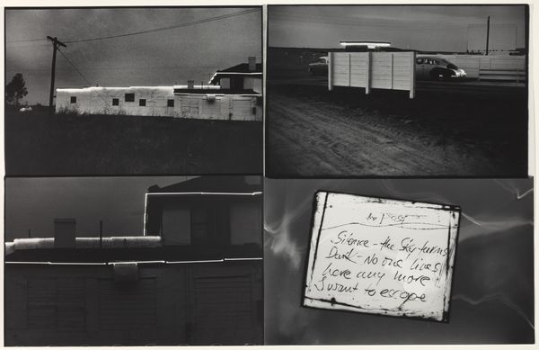 Curator: Robert Frank’s "Texas," a gelatin silver print from 1955, gives us a glimpse into the heart of the American road trip. It's a diptych, two photos stacked, like a visual rhyme of sorts. Editor: It's so raw, isn’t it? The stark contrast, the seemingly desolate landscape. There’s a haunting quality to it, a certain emptiness that gets under your skin. It reminds me of Wim Wenders film *Paris, Texas.* Curator: Definitely. There is an undeniably lonely mood. In the top half, we see a cafe, a Texaco gas pump, a truck and car; everyday symbols of a nation on the move. In the lower half, he crops in tighter on the back of a weathered car. Editor: It almost feels like a discarded relic of the American dream, parked under a Texaco sign. But, look, is there even anyone there? And that sign! The capitalist machine constantly signaling to its patrons even in desolation... It evokes something about consumer culture too, doesn’t it? Curator: The "Cafe" is such a bold statement—large simple lettering that is just asking people to stop and engage. It feels… desperate somehow, almost ironically staged for the photographer passing through. Editor: Exactly, it's the paradox of promise and reality. The starkness of the composition, the grit of the image—it’s a far cry from the shiny advertisements of the 1950s. I can’t help but feel that Frank is asking questions about progress and the price we pay. What does this unrelenting thirst for the road and capitalism cost us? Curator: Well, as the title reads: this *is* Texas. To me, the composition, these heavy shadows, this utilitarian scene is America plain, simple, unadorned. But what exactly *is* Frank's intent, eh? He invites a lot of reading into his work—a generous allowance if you ask me. Editor: Frank offers not a clear answer but a space for critical thought—prompting discussions about nationhood, identity, and disillusionment. Thank you for revealing so much! Curator: Thank *you*.