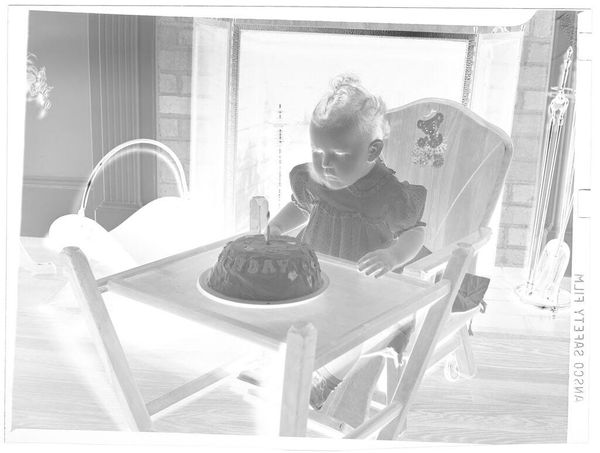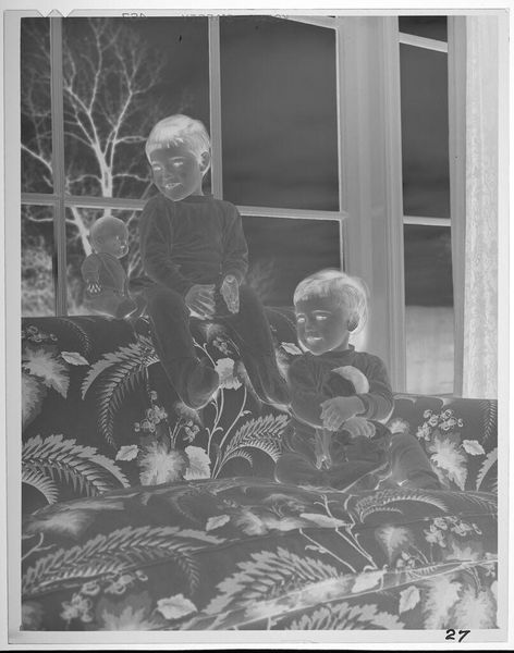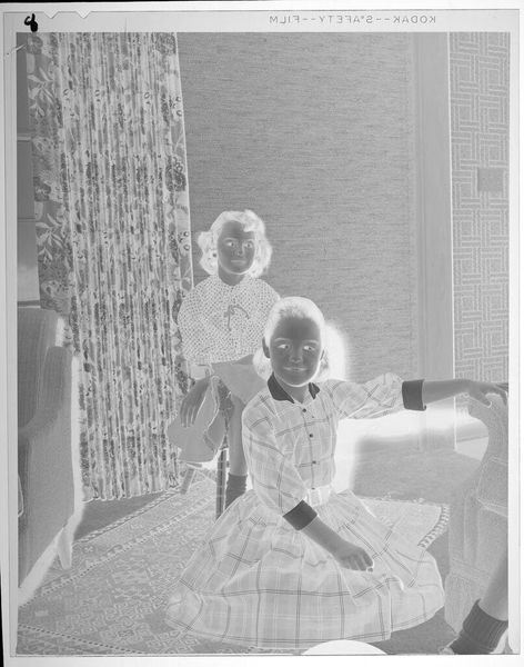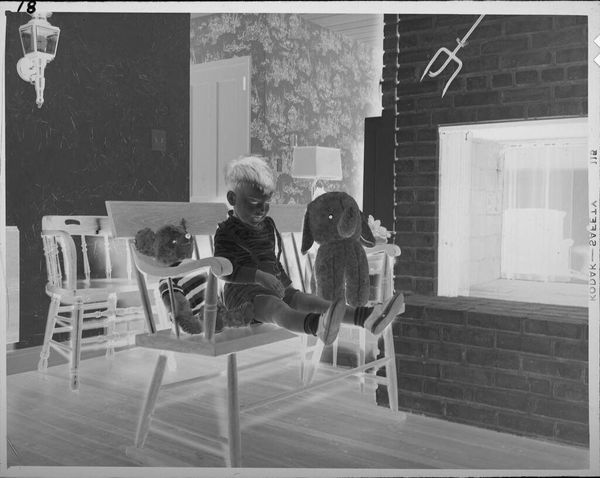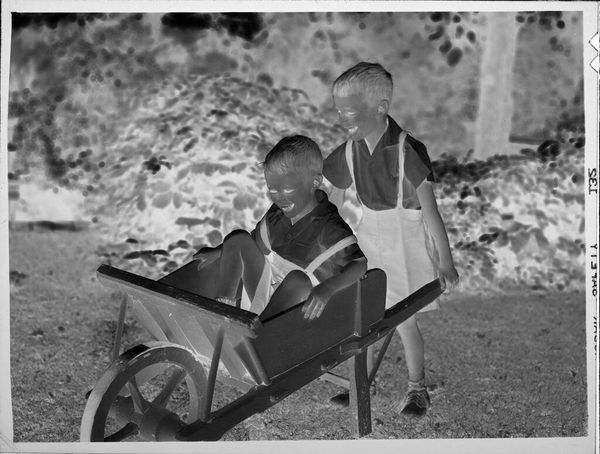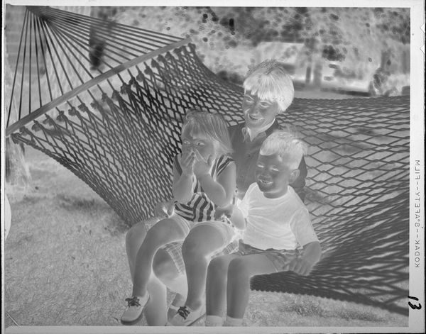 Curator: This is an untitled gelatin silver print by John Howell depicting two children on a bench. The dimensions are roughly 4 by 5 inches. Editor: The inverted tones lend an eerie stillness to the scene, almost like a memory fading. It feels simultaneously intimate and unsettling. Curator: The composition is fairly simple: two figures centered on a rustic bench, the wooden slats creating repetitive vertical lines that draw the eye upwards. Editor: Those stark contrasts amplify the power dynamics inherent in childhood, the constraints of dress and pose hinting at larger societal expectations. Who were these children and what roles were they being prepared to fill? Curator: Perhaps. Or maybe Howell was simply drawn to the interplay of light and shadow, using the children as formal elements in his exploration of texture and form. Editor: Possibly, but denying the social context impoverishes our understanding. Even in its abstraction, it speaks volumes about representation. Curator: A compelling photograph, regardless of interpretation. Editor: Absolutely, a snapshot of lost innocence within a world that is never truly black and white.