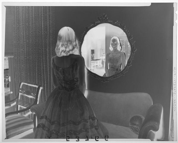 Editor: This intriguing vintage photograph, "Untitled (young woman in formal dress posed sitting in chair next to table)" by Martin Schweig, feels both intimate and a bit staged. The woman's pose is so deliberate. What leaps out at you when you look at this image? Curator: It's like peering into someone's memory, isn’t it? The stark contrast gives it a surreal quality. I wonder, is it a portrait, or is Schweig capturing a feeling, a mood? The way she’s posed, almost stiffly, suggests a performance, a role she’s playing, don't you think? Editor: That's a great point. I was so focused on the dress, but it really does feel like she's embodying a certain ideal. Curator: Exactly! And the lamp, the table, they're all props in her little stage. It's a fascinating study of presentation and perhaps, the constraints placed on women at that time. It makes you wonder what's going on beneath the surface, doesn't it? Editor: Definitely gives me a lot to think about, especially regarding the performance of identity. Curator: Indeed. These photographic negatives often reveal more than their creators intended.