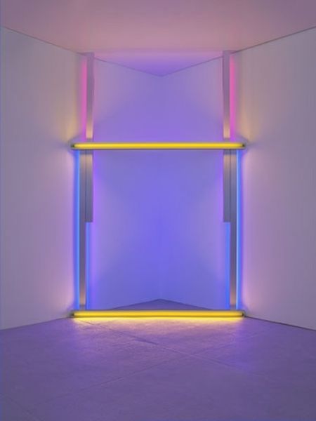 Curator: Well, this certainly brightens up the room! This installation is "The nominal three (to William of Ockham)" by Dan Flavin, created in 1963. It's currently part of the Guggenheim's collection here in New York. Editor: My first impression? Clinical. And yet, there’s a stark beauty. These fluorescent tubes, starkly placed, slice through the space. It's unsettling but clean. Curator: The clinical aspect is interesting because Flavin dedicated this piece to William of Ockham, a 14th-century philosopher known for Occam's Razor – the principle of simplicity. Do you think it captures that philosophical rigor? Editor: Absolutely, it reduces sculpture to its most basic elements: light, form, and industrial materials. There’s no carving, no casting, just the manipulation of readymade fluorescent tubes. It confronts the whole art market logic, no? It’s about democratizing access, where light itself is the medium available for anyone to utilize. Curator: Yes! The readily available aspect of the material is key, aligning it with Minimalist principles, right? Editor: Indeed, rejecting art's preciousness through its commitment to unadorned materials like, here, off-the-shelf light fixtures. By choosing these materials, Flavin subverts the preciousness usually associated with sculpture. This pushes viewers to confront the underlying structures shaping art, inviting examination of production and commodification in ways traditionally sidelined by art history’s obsession with originality. Curator: But don't you find it fascinating how these humble materials create such an ethereal effect? The glow transforms the surrounding architecture. The shadows dancing against the wall, a silent ballet. Editor: Sure, but the “ethereal” vibe relies on industrial capitalism, its infrastructures and waste disposals and extraction methods! But if the effect wasn’t “ethereal” then, probably, this wouldn’t be in the Guggenheim today. Curator: It’s a testament to art's transformative power – its ability to challenge our perceptions and highlight social considerations within familiar spaces. The stark simplicity invites reflection and makes me feel contemplative every time. Editor: Right! Flavin's work underscores how the everyday, even the commercially produced, when examined through a critical lens, becomes an occasion to reassess and maybe dismantle conventions.