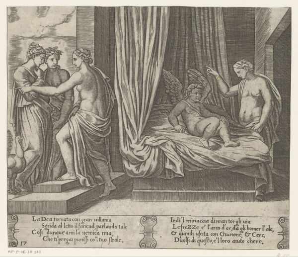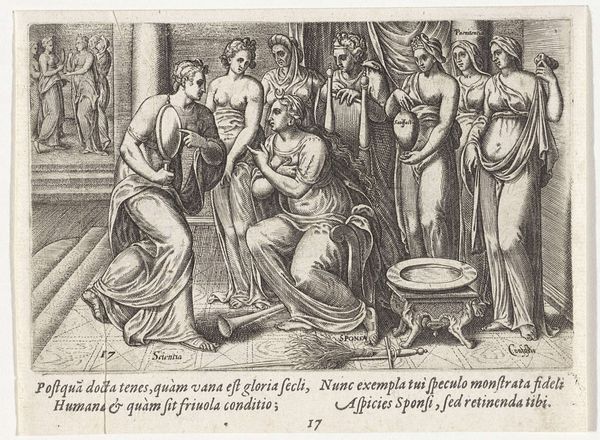 Curator: This engraving, held at the Rijksmuseum, is entitled "The Bride Among Music-Making Maidens," dating back to 1574, by Wierix. What catches your eye? Editor: It's fascinating how stiff and posed the figures seem, yet the composition has a strange vibrancy. Is this a Mannerist allegory perhaps, the bride looking a little overwhelmed amidst the flurry of musicians? Curator: Indeed, it’s a compelling blend of Mannerist style with hints of Baroque sensibilities. Wierix clearly employs allegory, placing the bride—representing perhaps the soul—within a staged environment of musical harmony, the maidens symbolizing different virtues contributing to a successful union. But whose union? And what type is it? Editor: Perhaps this print served some didactic purpose, suggesting that a virtuous life, full of harmonious acts, leads to spiritual richness—to the metaphorical wedding of the soul and the spirit, as indicated in the Latin text inscribed at the bottom? It reads as highly gendered, too, framing virtue through the lens of a bride in the 16th century. We might unpack that. Curator: Precisely! Examining this work within its socio-historical context, we see how constructions of ideal womanhood, marriage, and spiritual devotion intertwined with political and religious ideologies of the era. The very act of portraying these figures with such formality conveys a deliberate message. Editor: It’s that very formality that jars me. It presents a specific notion of grace, carefully managed. The bride’s passivity, surrounded by active virtues presented as female figures. It raises many questions about power dynamics and expectations for women at the time, especially viewed from a contemporary perspective. How might we read this now, beyond art historical terms? Curator: By situating this work within contemporary theory, we see a layered engagement, challenging not just the aesthetic values of the era, but also unveiling power structures that underpin gendered expectations even now. It’s in considering art’s connection to identity, race, gender, and power dynamics that new dialogues with history arise. Editor: This offers a lens for viewing this image, and others from the time, within shifting understandings of these critical contexts. Thank you. Curator: Indeed. Thanks to this dialogue, we see beyond the apparent virtues into a mirror reflecting on ongoing gender and societal conversations.